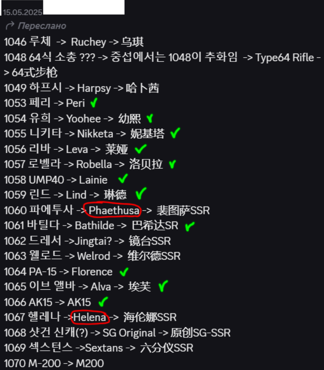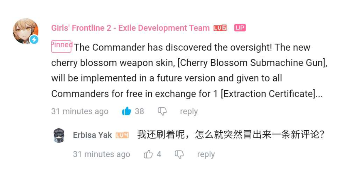 Следующая кукла, Сакура, будет завязана с механиками своего фургончика, по типу механик Клюкай и Воймастины. Южмых, знает, что игрокам нужно больше свободы и хочет сделать как можно скорее возможность через меню шопа забрать все ежедневные награды разом одним нажатием. Сейчас заканчивается разработка идеи не 20-ти, а тридцать дневного промежутка между выходом контента на Китае. Это позволит притормозить китайский сервер и ускорить глобал. На недавнем совещании, представители Санборн были недовольны финансовыми показателями игры и сейчас идет дискуссия как это можно исправить. В разработке две концепции сосредоточится на выпуске крупных мажорных обновлений раз в 3 месяца с огромным количеством контента как это было с Искрой или сосредоточится на глобале, а именно на продвижении игры в еще не охваченных регионах с привлечением региональных плюшек. Южонг, хочет провести коллаб и Делта Форс.