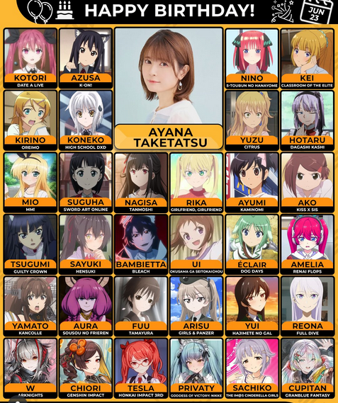 Аяна Такэтацу — японская сэйю и певица. Начала карьеру в 2007 году и быстро стала известна благодаря ролям ярких и цундерэ-персонажей. Среди её самых популярных работ — Адзуса Накано в K-ON!, Кирино Косака в Oreimo, Конэко Тодзё в High School DxD, Тиори из Genshin Impact и Сугуха Киригая (Лифа) в Sword Art Online.