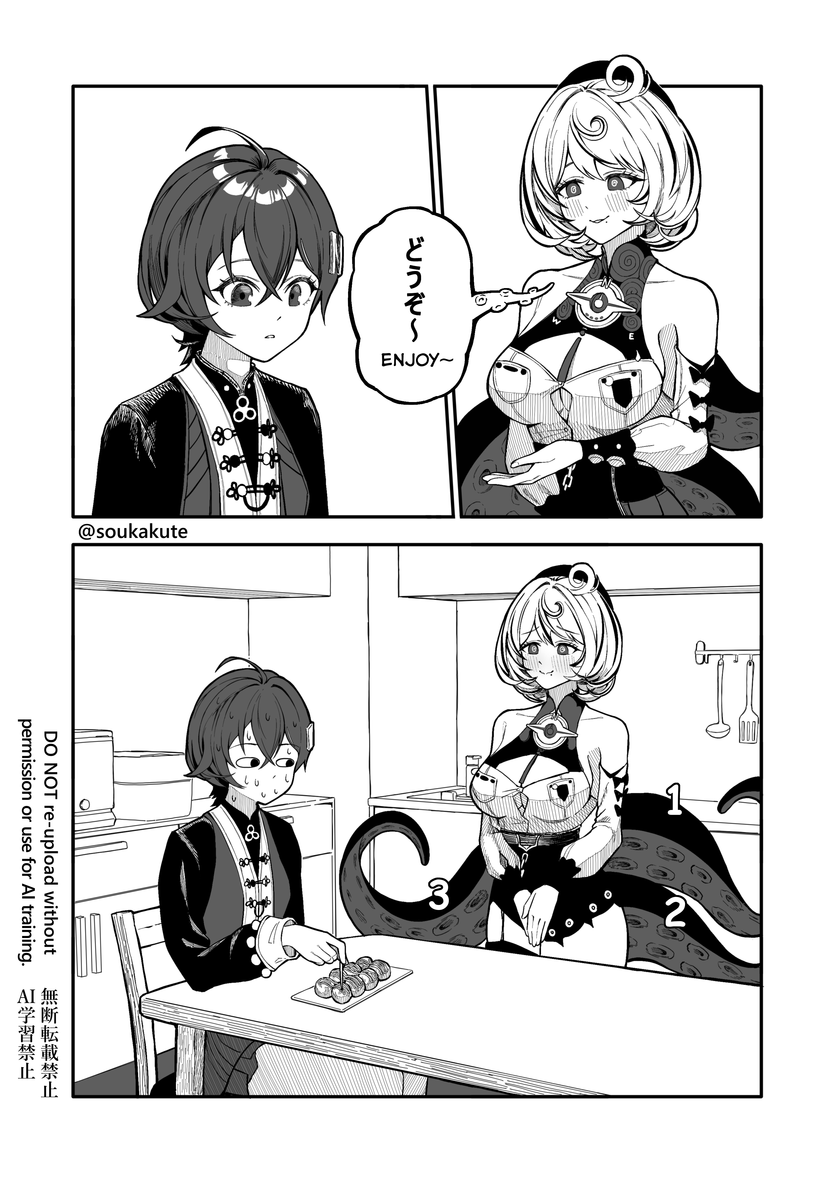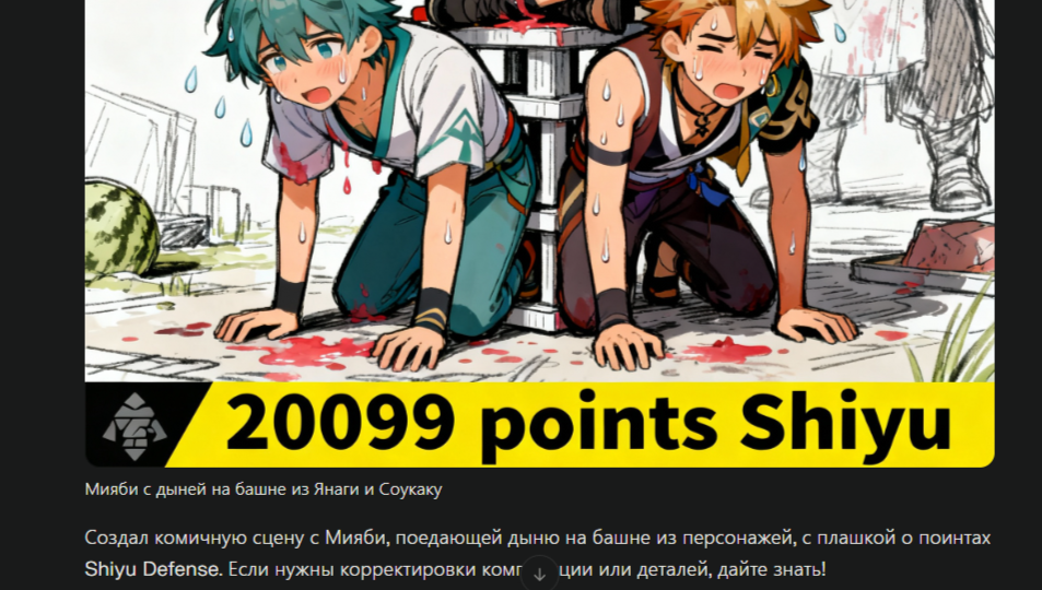 Пусть нарисует Мияба которая жрет дыню жоско прям во все стороны соки брузжут и сидит свесив ноги на спине Янаги и Юзухи, они стоят на коленях друг на дружке башней. На фоне стоит дохлый мясник или этот с рукой босс, внизу плашка 20099 поинтов шию. Янаги и Юзуха прям пиздос потеют пока держат башню.