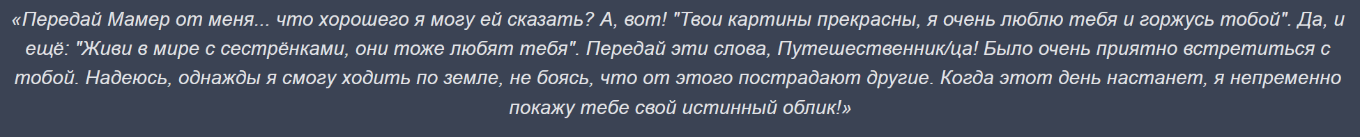 🩵 №??? — «Тейват» Здесь Октавия подружилась с Ведьмами Шабаша. Она многому научилась у них и преодолела одиночество. Подруги сообща создавали чудесные миры по типу Симуланки и за это время Октавия поняла, что и её собственному миру, внутри Астрального предела, нужны главные герои. Октавия решила, что на эту роль годятся ГГ и Паймон, а потому дала им доступ к Астральному пределу. Теперь мы, игроки, используя этот суперкомпьютер, можем создавать интересные виртуальные миры (мини-игры).
