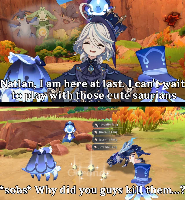 В итоге мудрым и всеми уважаемым правителем Фонтейна стал юдекс Нёвиллет, а как относятся к Фурине простые фонтейновцы, показывается в первые же пять минут мейнквеста - как к плохой клоунессе, которая по ошибке получила власть и стала заебывать аж целый регион своим самодурством и тупыми шутками.
