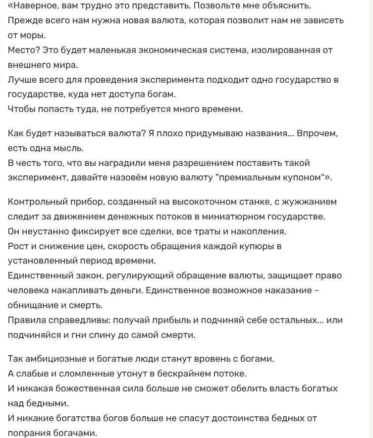 >у неё было буквально всё, чтоб вырасти в мудрую уважаемую всеми правительницу - время, деньги, власть Нет, не всё. Ты забыл уточнить очень важную главную особенность - личные качества. Это очень важно на самом деле, предрасположенность к тому или иному деянию во многом является решающей для её успешного достижения успехов. А власть, любая власть - это очень едкий клубок интриг, в котором не каждый человек вывезет существовать. И если по характеру Фурина ну прям вообще не такой была, то тут самым для неё верным решением было действительно абстрагироваться от всего этого. Ну не рождена она для этого, не её это. Я понимаю. Я вот например по природе своей не торгаш, вот вообще ни капли, у меня предрасположенность не та. (И при этом я встречал чувака с врождённой торгашеской жилкой. В санатории как-то будучи пиздюком отдыхал: купался, на пляже загорал и всё такое. Как-то мы с пацанами нашли место с крабами, бегали, смотрели на них, любовались... и только один из моих ровесников додумался собирать этих крабов в коробочку, а по возвращению в лагерный корпус барыжить мелкими крабами за 50р штука. Спрос, к слову, был, а конкурентов у юного торговца так и не появилось.)
