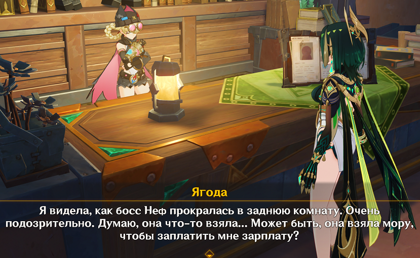 Какая же Нефер всё таки злыдня. Бедная Ягодка, работает на шефа-деспота, ещё и в регионе промышляющего бандитизма... Уверен, что дай Нефер приемлемую цену - она Ягодку без зазрения совести с потрохами сдаст. Ну а что ещё ожидать от сумерской пустынницы