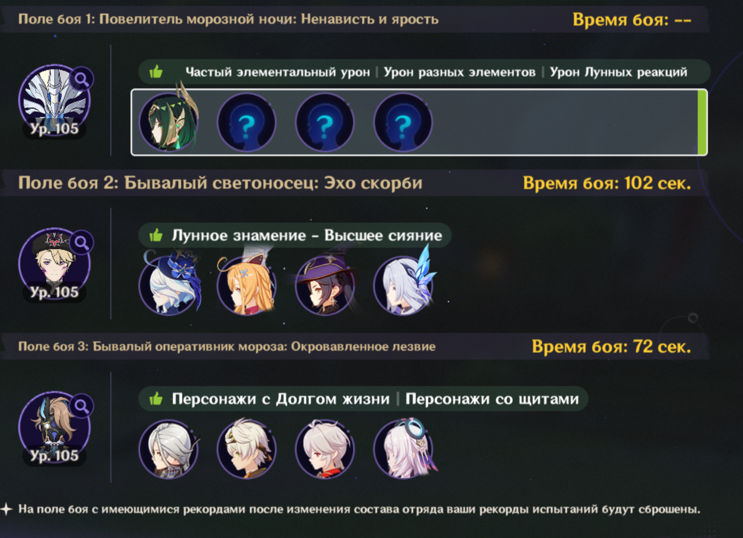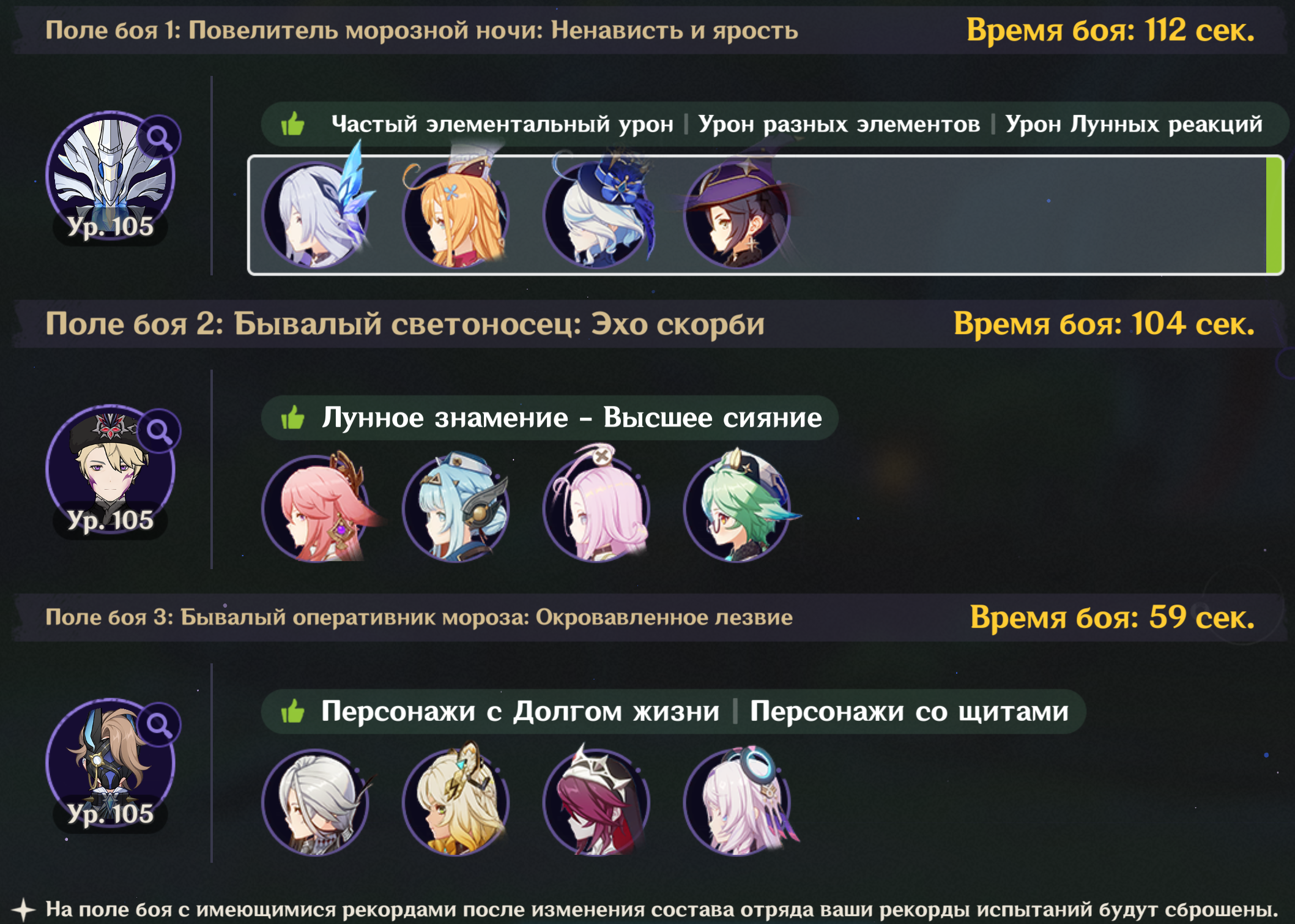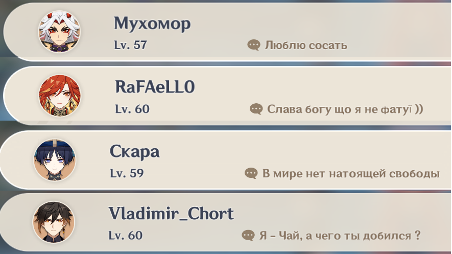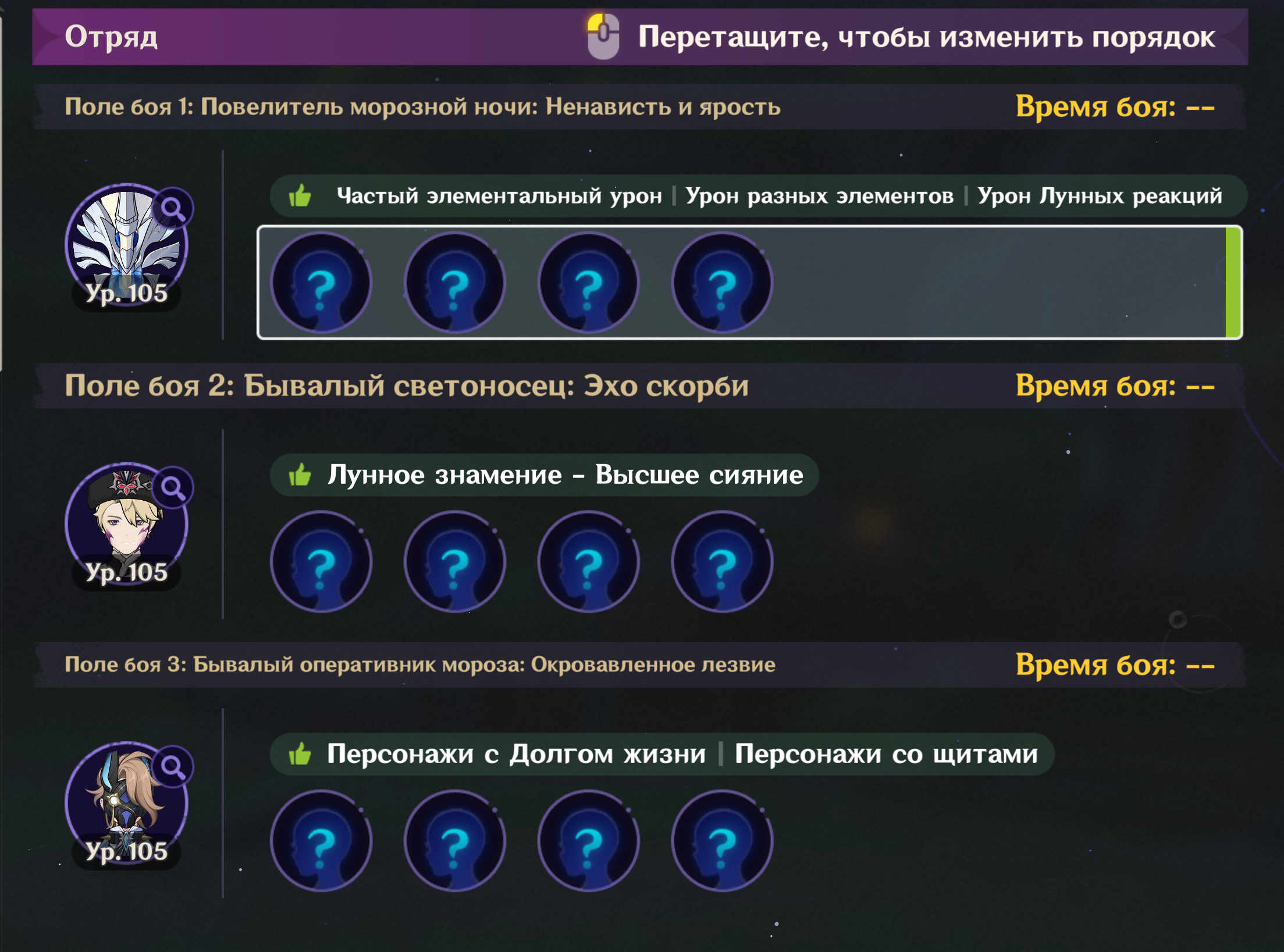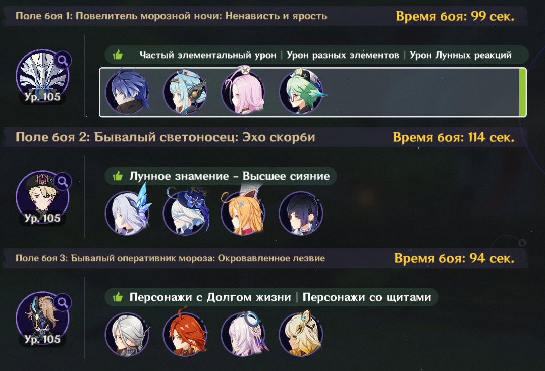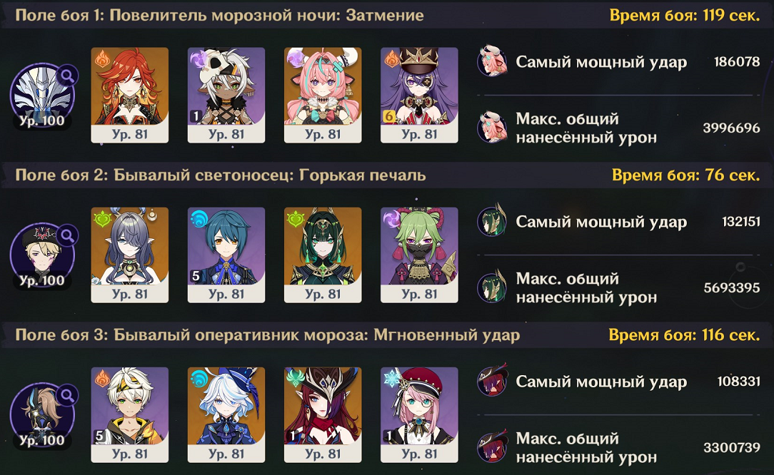 Всем привет. У меня давно идея, собрать отдельный отряд для каждого региона. Но есть некоторые нюансы: 1. Персонажи должны быть из проходимого региона. То есть, если проходим Мондштадт, то персонажи должны быть исключительно оттуда. 2. Исключительно женские персонажи и никаких лолей. Очень желательно, чтобы были взрослые женщины только в отряде (по типу Нин Гуан, Бэй Доу и Сянь Юнь), но обычные женские персонажи тоже подойдут, главное без лолей. 3. За цифры не гоняюсь, но важно, чтобы я мог закрывать сюжетный контент и выдавал хоть какой-то годный урон.