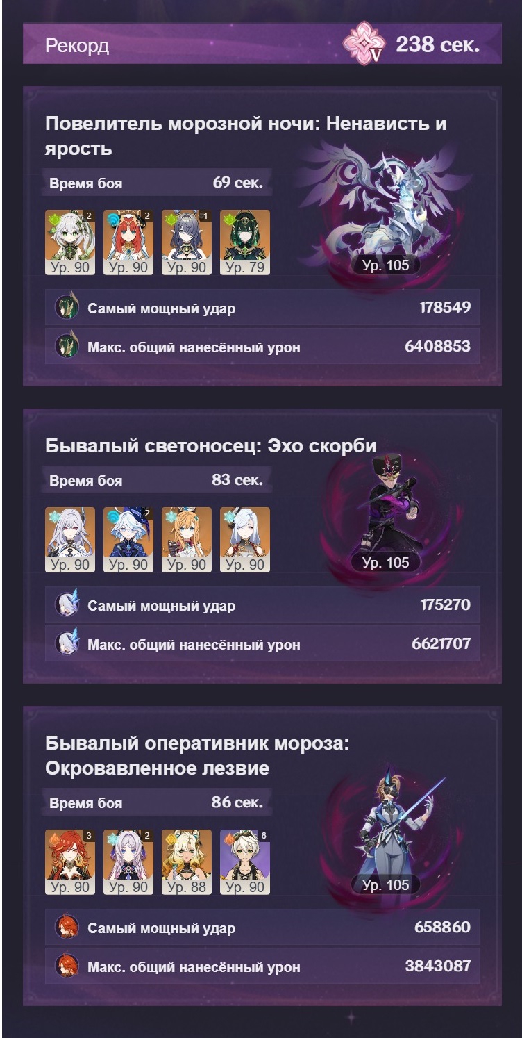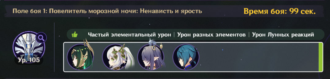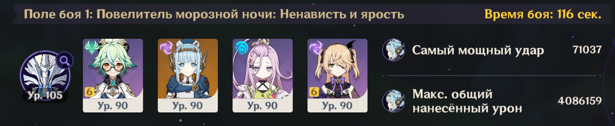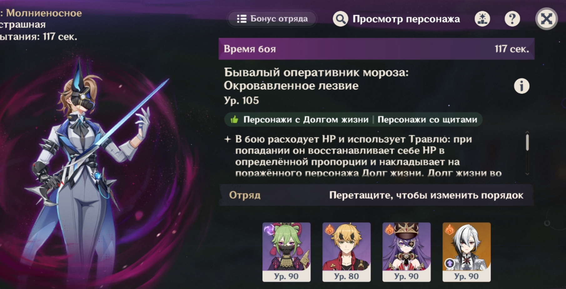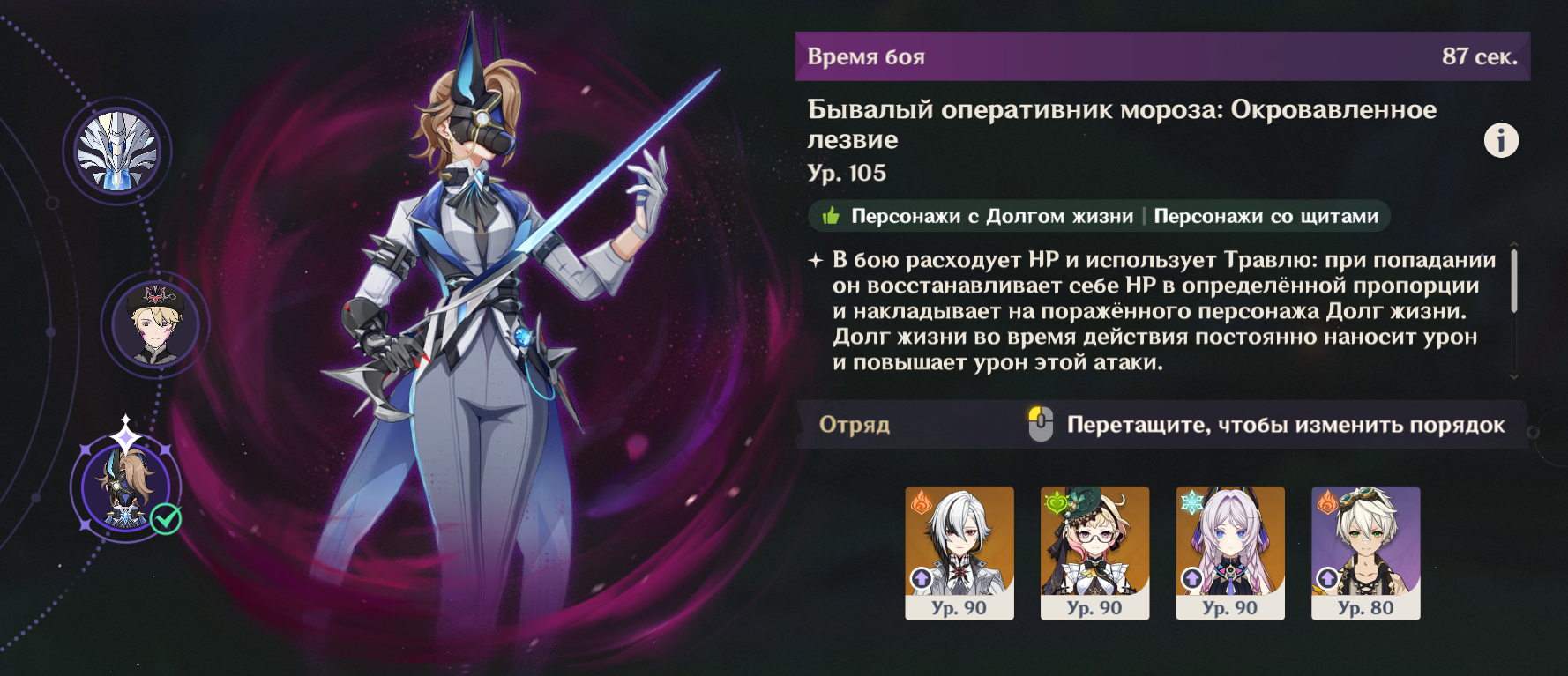 В общем от нечего делать решил попробовать пройти третий Натиск своей соло вайфушкой-четвёркой. Чтобы потом всем в треде хвалится, как же я хорош! Решил начать с конца, выбрал первым боем фатуйку и она очень легко пронеслась, буквально с первого же раза. Ну, подумал я, значит дальше также просто будет... Но второй мой соперник, этот хер в меховой шапке, он просто меня унижал. И мне то времени не хватает, то он просто выносит меня с нескольких тычек, под которые мне не везло попадать, в общем тяжело было. Особенно сливаться от случайного урона после пяти минут прохождения - такое было часто.