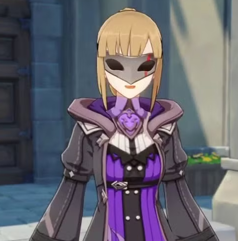 Держи, вот твоя маска фатуев... Правда, в связи с тем, что у нас нехватка одного предвестника, который недавно сбежал, выдадим тебе как раз таки масочку из её забытого гардероба. Слегка поношена и пахнет Субреткой, но надеюсь ты не против. Это всё равно в некотором роде маска фатуев.