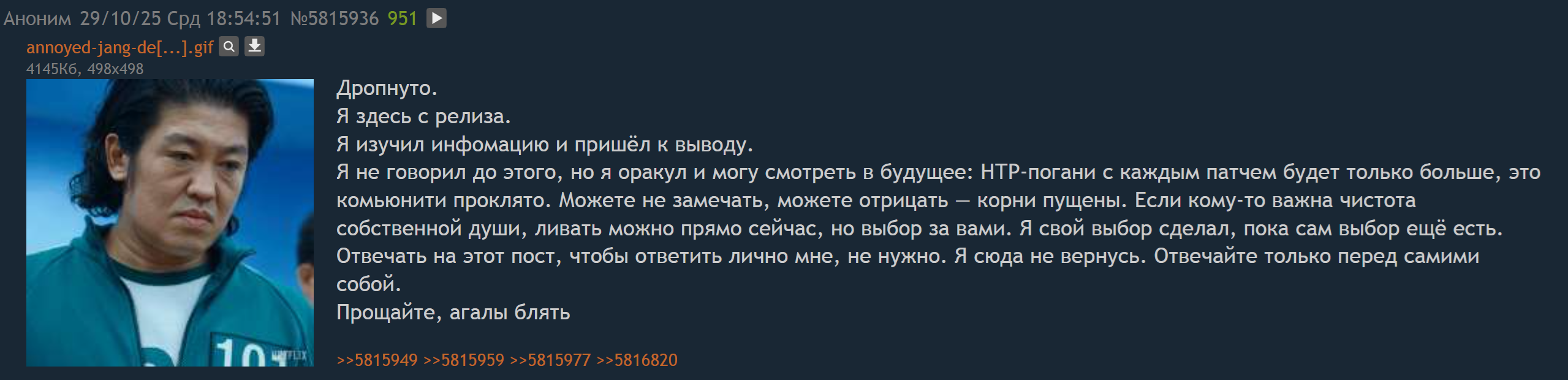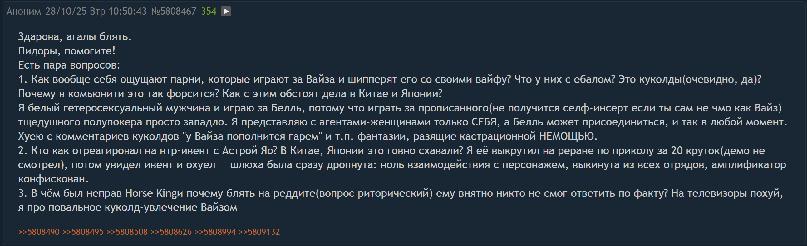 >>5821946 бля, ладно бы ты на него пиздел когда в своих командах персы бы хуй сосали, типо как копша или акула хуй посасывают даже там где атакеры нужны, просто потому что боссы нового типа дают пизды старым персам не давая им дамажить, но взяв по неправильному саппорту в две команды, а потом обосрав панамку что у него в эндгейме не пролететь ебалом по клаве с гавном в командах это конечно сильно