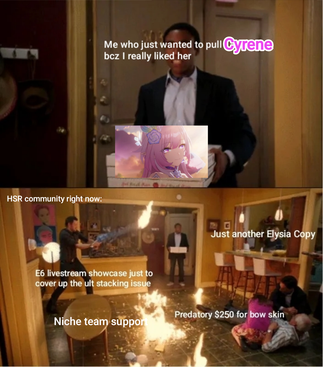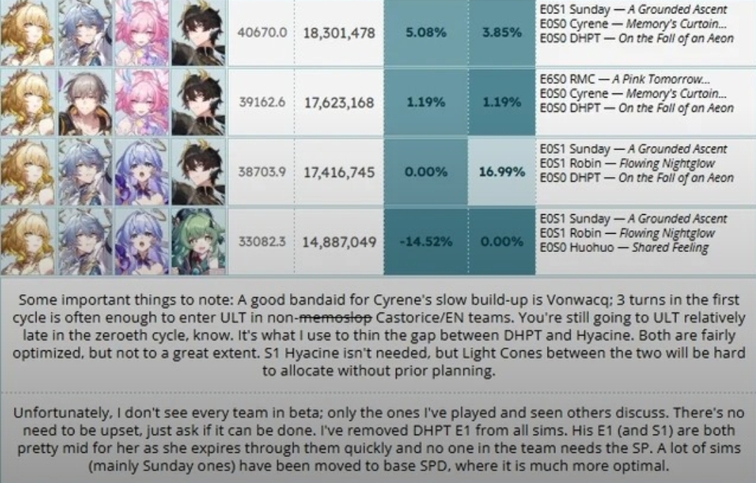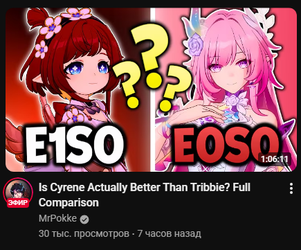 То есть Кирена НЕ Т5 юнит. НЕ мусор. НО. Она балансная. Требует конкретные чёткие пачки и планирование на будущее касательно её эйдолонов, с чёткой расстановкой приоритетов. Тебе нужен самый сильный Анакса в мире? Е2 Кирена мастхев. В пачках Памяти она будет играть. НО. Тьмарт приоритетнее для пачек Памяти. И проблема в том. Что Тьмарт на Е2 дамажнее Е2 Кирены. Правда я не вижел Киерну с 240 спд, что у неё в капе, мб оно меняет положения вещей. Но не отменяет факта, что Тьмарт кап своих стаков имеет в 999.