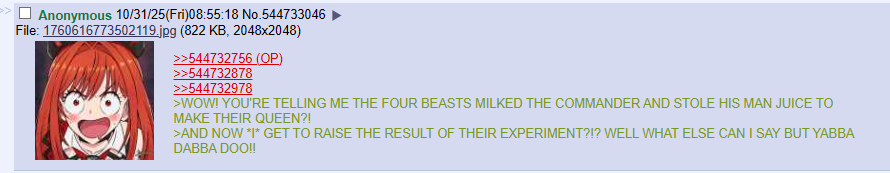 Четыре биста - ебучие дегенераты, как они умудрились создать "королеву", я удивляюсь. Бахамутик - дегенерат в квадрате, но забавная. На данный момент самая безобидная из всей четверки. В целом, конечно, всех трахать, Бегемотик чудесная. Интро главы с описанием чудодейственной жидкости из шкиканского тела вгоняет в краску.
