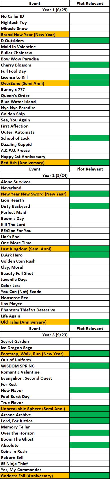 Ну, в отличие опять же, от прочих, у нас тут нормальный архив и у сайд-стори есть чёткие подсказки по временным рамкам событий. Ну а кроме Линейной сюжетки, сайд-стори и больших ивентов, всё остальное - это так, милый и приятный. но не обязательный факультатив. Никакой хронологической сложности и запутанности нет, в отличие например от Ушей. Вот где-где, а там конечно настоящая жопа. На самый банальный вопрос: где и кто из 350+ персонажей когда участвовал ответа нет даже в вики. И я умолчу про килотонну уникальных неписей.
