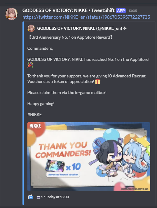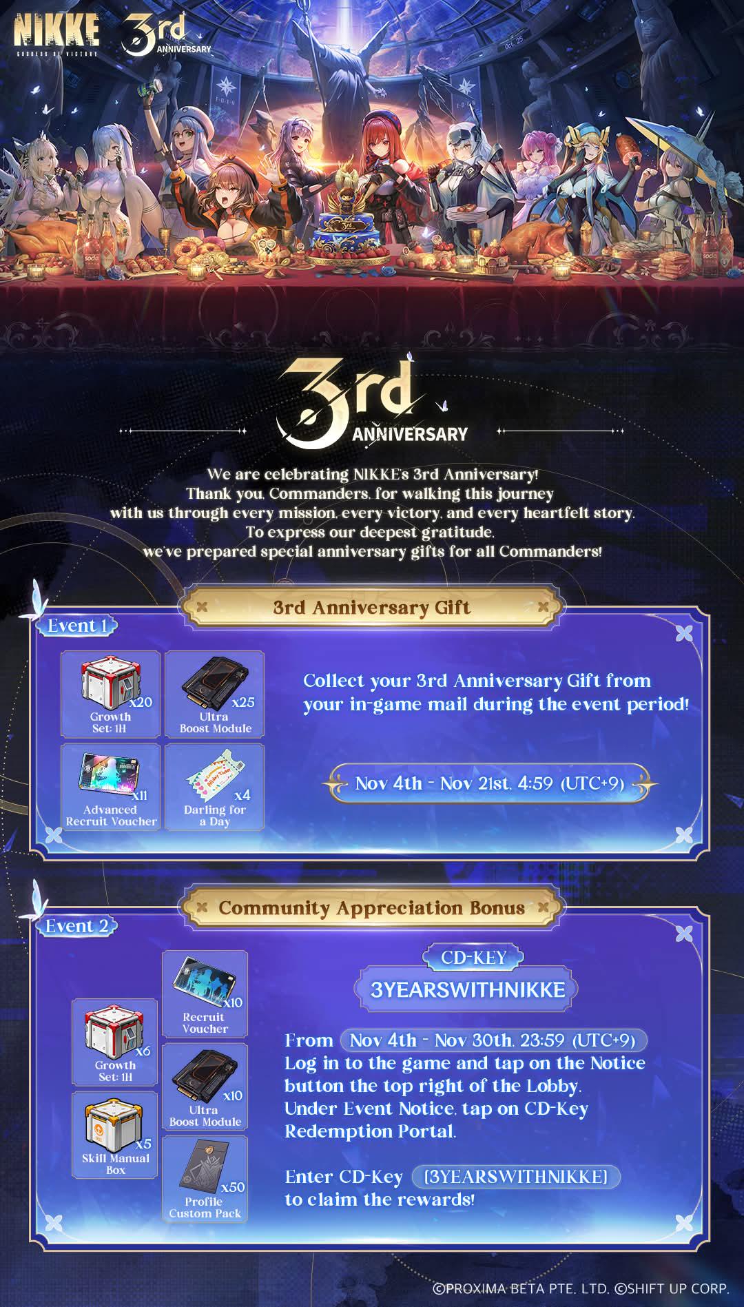 3YEARSWITHNIKKENov. 510 x Recruit Voucher NEW 3YEARSWITHCOMMANDEROct. 25900 x Gems 1 x Advanced Recruit Voucher PUNYQUEENOct. 2510 x Advanced Recruit Voucher IAMNAYUTAOct. 255 x Recruit Voucher