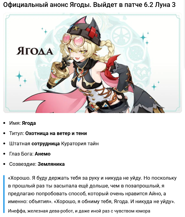 >на которого прогревали еще со времен сумеру Архонты всегда были базой и они считай изначально прогреты с самого начала игры. Заочно. И то, что Мявуика выделяется в худшую сторону - это как раз таки проблема не того, что её не рекламили со старта, а того, что она неудачна как Архонт.
