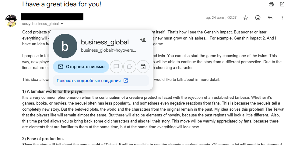 >>5822985 Не нашёл. Да и смысл, мне даже на прошлое моё письмо не ответили, хотя я дельную идею им на коммерческую почту скинул. Хотел в долю влезть, но ему видимо не нужны светлые умы.