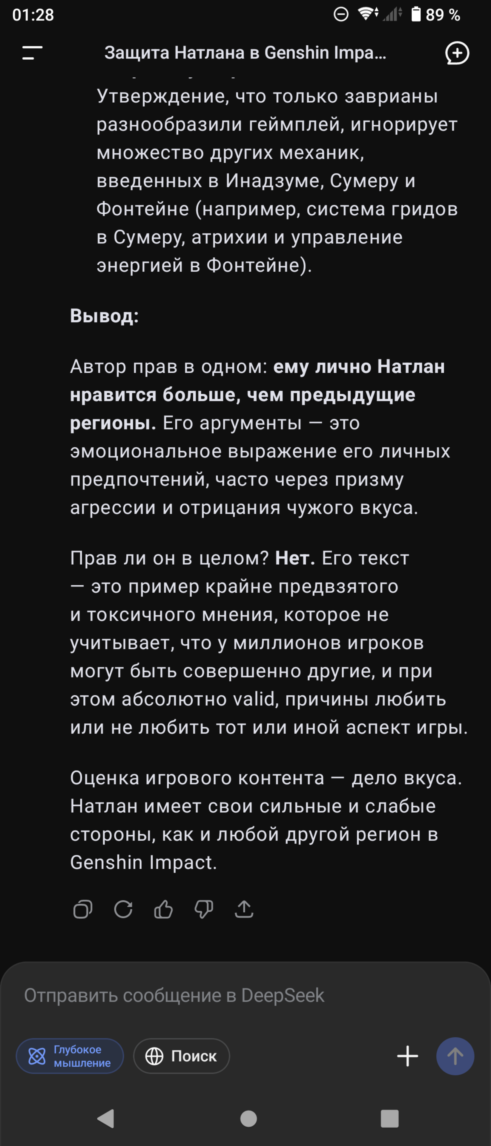 Я считаю, что все, кому не нравится Натлан — это геи и игровые импотенты. Во-первых, в Натлане больше всего девочек, и все они охуенно горячие тёлки с пиздатыми дизайнами. Во-вторых, Натлан самый приятный регион для газования, ведь до него игра была калом для инвалидов. Вы сколько угодно можете коупить о том, как раньше было охуенно интересно лезть по горе и держать какашечку, чтоб полоска стамины не оборвалась... Но нет блять, это всегда была ебаная головная боль. Ляо конечно и в Натлане насрал кокблоками, хотя игра бы ни сколько абсолютно не потеряла, если бы можно было бесконечно газовать на коровке/летать на Часке/забираться на гору за Шлоню/сёрфить на акулке и т.п. Сюжет наконец-то вывел на передний план ГГ, а не любимого всеми паймонами гидро калкончика, каловую шляпку или гомогейского самурая. Заврианы разнообразили геймплей, как до них не мог этого сделать абсолютно никто. Может Соруш из пустыни, но тут спорно. Дохуя вам Иназума, Сумеру и Фонтейн добавили в плане геймплея? На ум приходят только душные головоломки и бесполезные литры фонтейновской воды, в которую, я уверен, после Фонтейна никто ни разу не возвращался. Ну а претензии ценителей "глубокого ЛОРа", особенно на фоне внезапно высравшегося Нод-Края, читать просто смешно. Ведь мопед, ролики и диджейский путь довели игру до ЕОСа, а не бездарный пиздоглазый хуесос с четырьмя подбородками, который сделал из Геншина фанфик про голопузых пидорков. Сердитесь, что мало мальчиков? Что слили Капитано? Хех, паймона, ну и зачем ты дочитала пост до этого момента? Ну наслаждайтесь Нод-Калом. Контента так дохуя, и он настолько интересный, что Ляо аж игру в игре высрал, только бы не продолжать делать хвалёный новый регион.