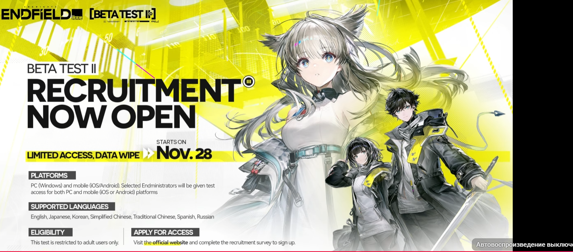 Об игре: Прямой сиквел лучшей двухмерной гачи Arknights, теперь полноценном 3D и с открытым миром! В игре будет русский язык. Дата релиза - предположительно 1й квартал 2026.