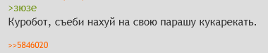 >>5846048 Даже скрин не буду открывать. Мне похуй че ты там спизданешь в оправдание, используешь маркер куробота/ебанутого хейтера - твои слова нихуя не стоят, просто наброс. Разбираться по какой из причин ты ущербный не стоит. Возможно ты один из 100 даунов, который просто пишет смищное слово повторяя за набрасывающими, но тогда с тобой нет смысла говорить по причине лоу айсикью.