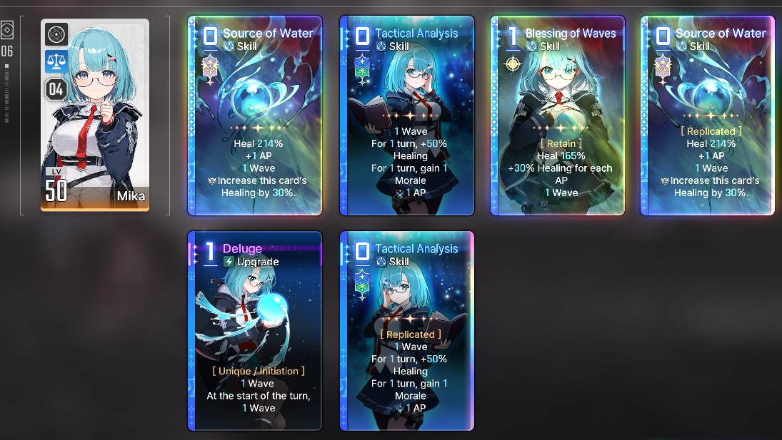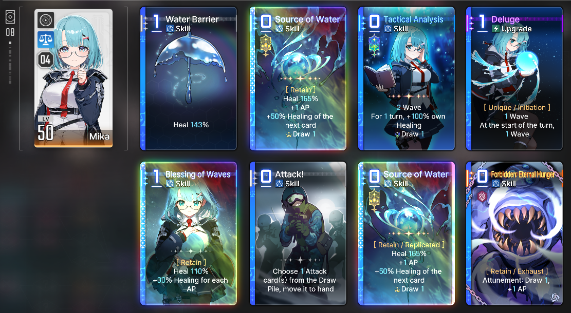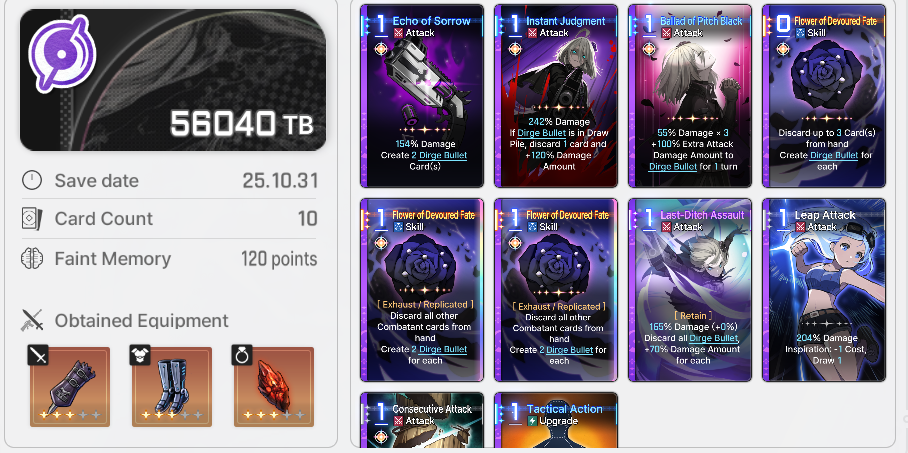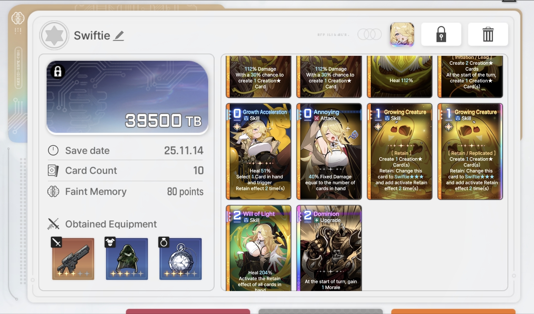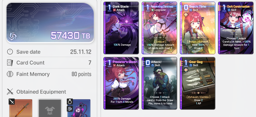 Даётся 2 очка действий и +1 за каждые 3 сложности после первой (5 макс). Можно потратить на удаление карты (2 макс), копирование карт персонажа (2 макс), замену карт персонажа (1 макс) и покупку/копирование нейтральной карты. Монстр карта = нейтральная карта с (1 макс) лимитом. Всё что превышает пороги в процессе забега - помечается меткой, не тратит очки действий и не сохраняется в сейв дату.