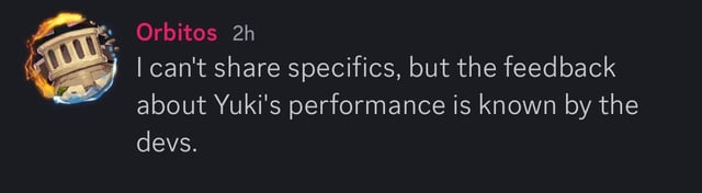 — Разработчики внимательно изучили фидбек по поводу нового персонажа Юки. — В своей роли (бои против 2+ врагов) она показывает себя отлично. — Однако разработчики намерены заменить её наименее популярные прозрения, а также усилить её сборку в урон по одной цели. Это произойдёт в будущих обновлениях. — Помимо этого, в ближайшем обновлении будет новый контент, где Юки сможет показать себя.