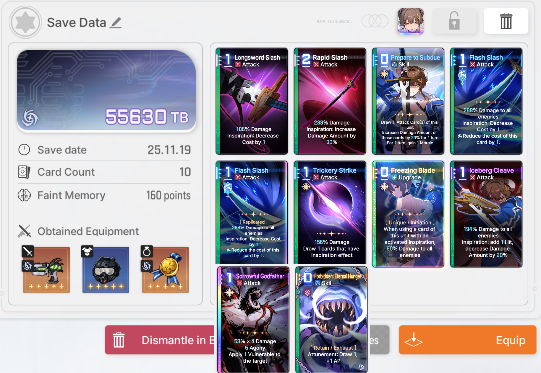 Ньювжушк вкатился с 4 дня а потом проебал 2 недели потому что не понял что ебет голову запрет а не сервак геймплейно игра охуенная, с хаоса балдею, система с сейв датой гениальная чтоб стимулировать тебя дрочить рогалик и искать билды, правда мне за 4 рана буквально каждая ремувнутая карта вернулась в конце рана сук. В упор не понимаю, почему при таком очевидном вдохновении Chrono Ark ГГ не сделан аки Люси как 4 член команды вне боя чтобы дровать карты и кастовать мета хуйню, убило бы 80% драмы вокруг бесполезности и улучшило геймплей. Ну да ладно, играется бодро и на том спасибо. Хару не пришла, пришла шлюха в бодисьюте с катаной, сделал ей сносную деку, контент на 30лвл выносится без рук но я уже понял что лафа будет недолгая и зеро система будет ебать. Вопросы 1) Есть смысл роллить вторую нынешнюю шлюху с катаной? 2) Кого ставить под Рин? Рей точно с ней бодро идет но хз кого 3, пока стоит Берил ради сникерса и добивания бомжей ретейнутыми картами 3) Куда сливать стамину? Я так понимаю ситуация с ресурсами станет только хуже
