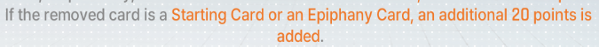 Neutral Cards: +20 points Monster Cards: +80 points Regular Epiphanies: +0 points for Starting and Unique cards, +10 points for Neutral or Monster cards Divine Epiphanies: +20 points Card Removal: +0 for first, then +10/30/50/70, and +20 if its a Starting card or "Epiphany card" (this term isn't used elsewhere so not entirely sure what exactly its referring to- might be Unique Cards)