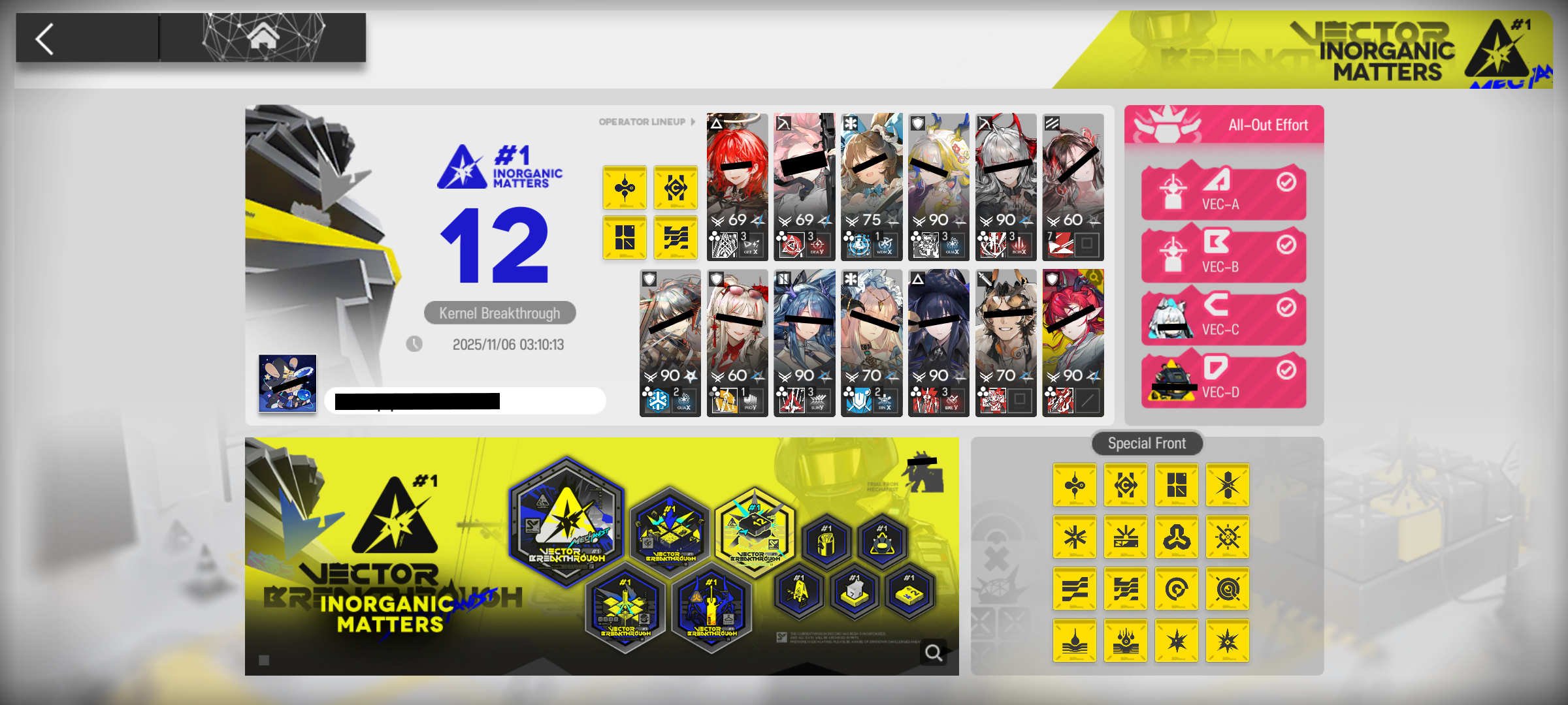 Открыт ивент Vector Breakthrough #1 Inorganic Matters. Vector Breakthrough #1 Inorganic Matters начался 30 октября и продлится до 20 ноября, участвуйте в сложных боях с элитным оперативником Механистом и получайте разные награды! Также в ивенте присутствуют свои бафы, для получения которых надо проходить отдельные карты и оставлять там операторов, с которыми и прошли, в гарнизонах. Операторы из гарнизонов недоступны в линейке боёв, только если их заменить другими.