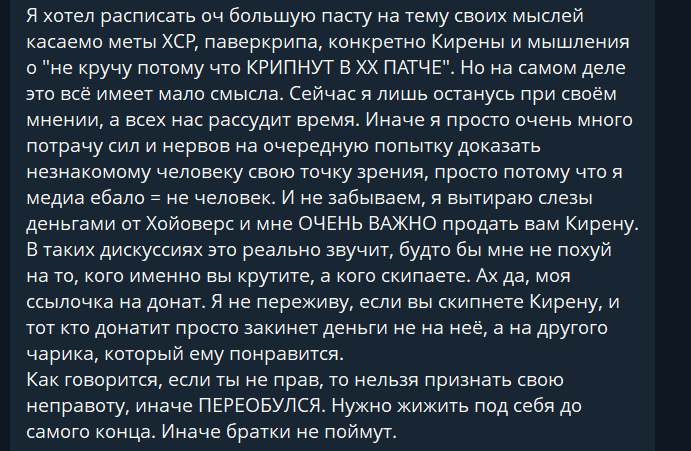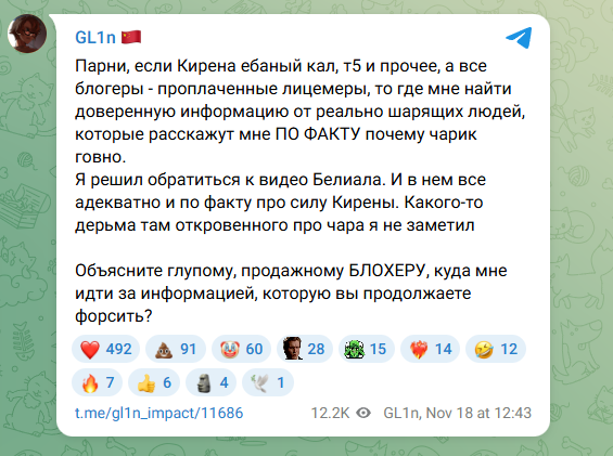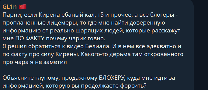Парни, если Кирена ебаный кал, т5 и прочее, а все блогеры - проплаченные лицемеры, то где мне найти доверенную информацию от реально шарящих людей, которые расскажут мне ПО ФАКТУ почему чарик говно. Я решил обратиться к видео Белиала. И в нем все адекватно и по факту про силу Кирены. Какого-то дерьма там откровенного про чара я не заметил