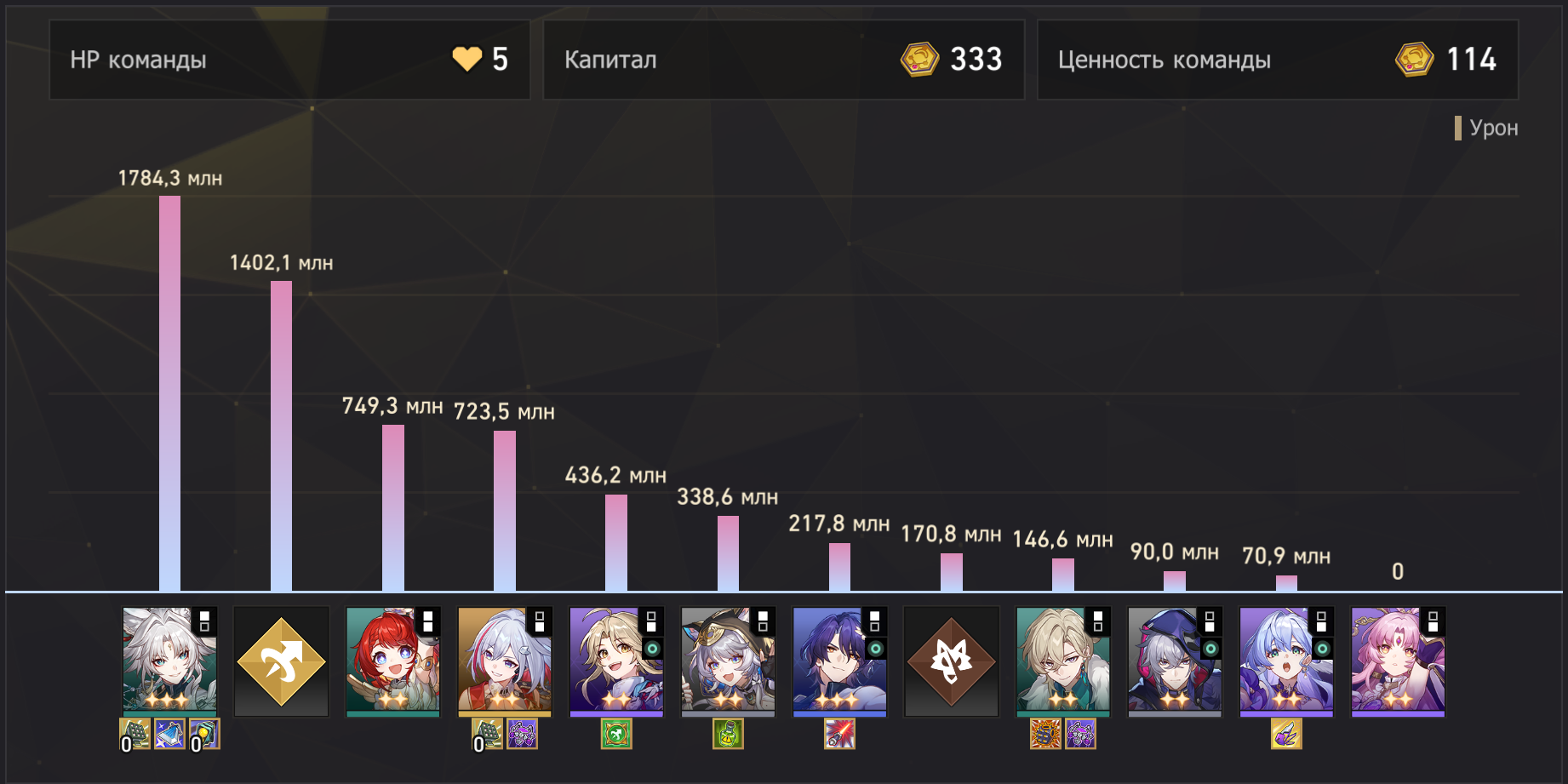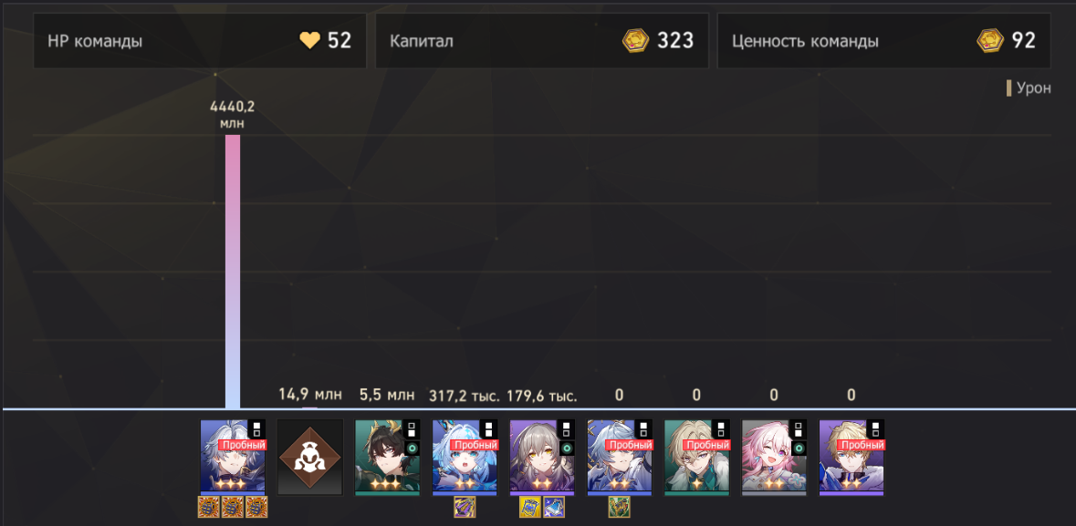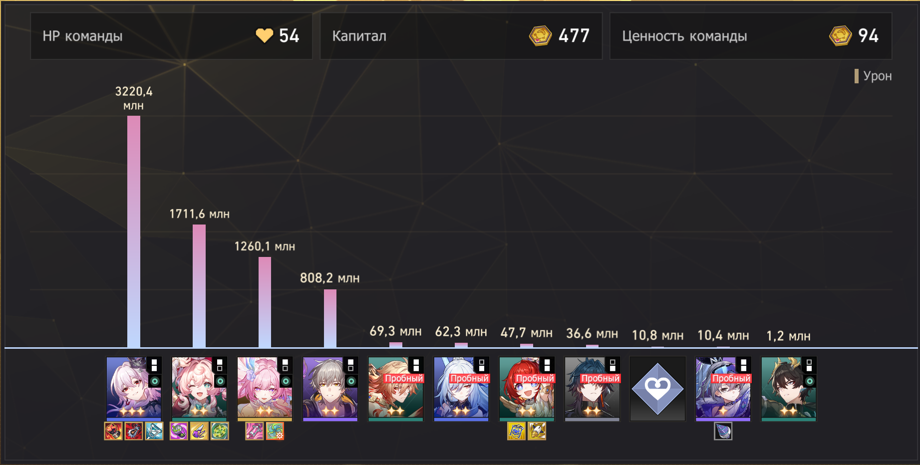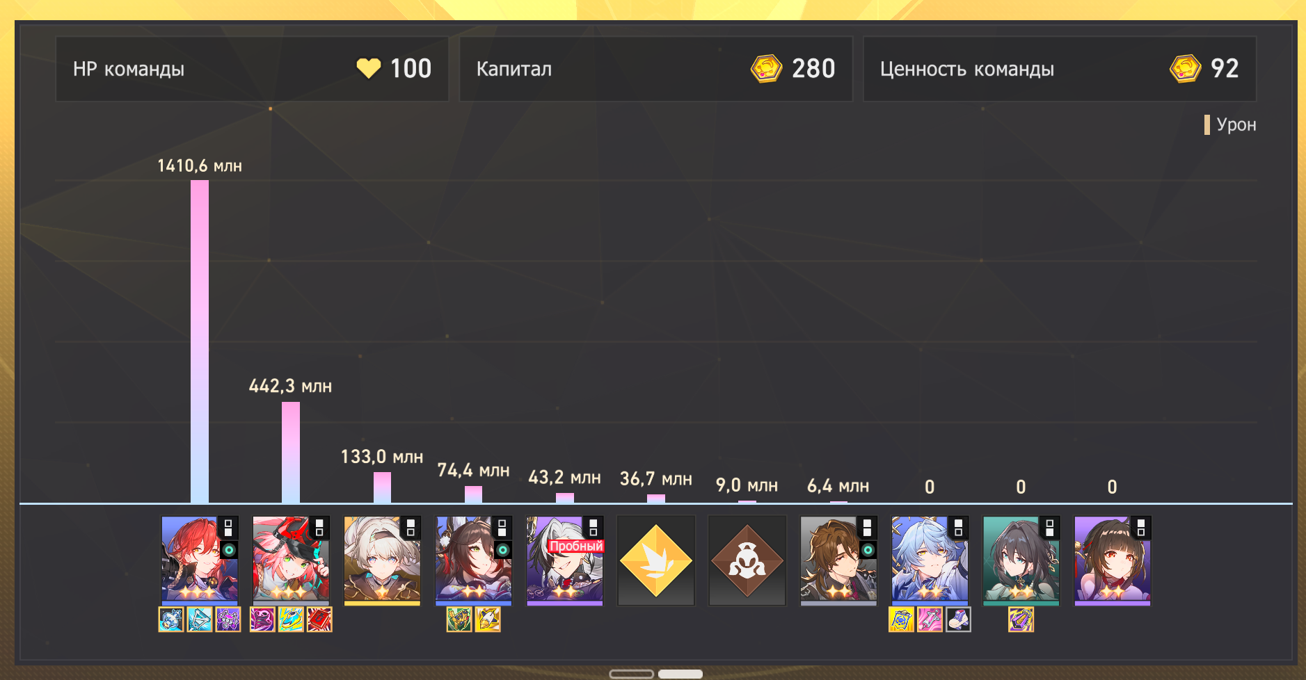 Все остальные персы там ситуативны, Кафку можно вообще выкинуть когда собрал кор, Жуань не нужна, Гиацина тоже, но взять пришлось потому что афикс выпал ебанутый на рефлект, а она очень хорошо хилит. В идеале вместо Гиацины взять Наташу с Гепардом, тогда робот будет больно стукать, но они должны быть одеты, иначе пачка упадёт.