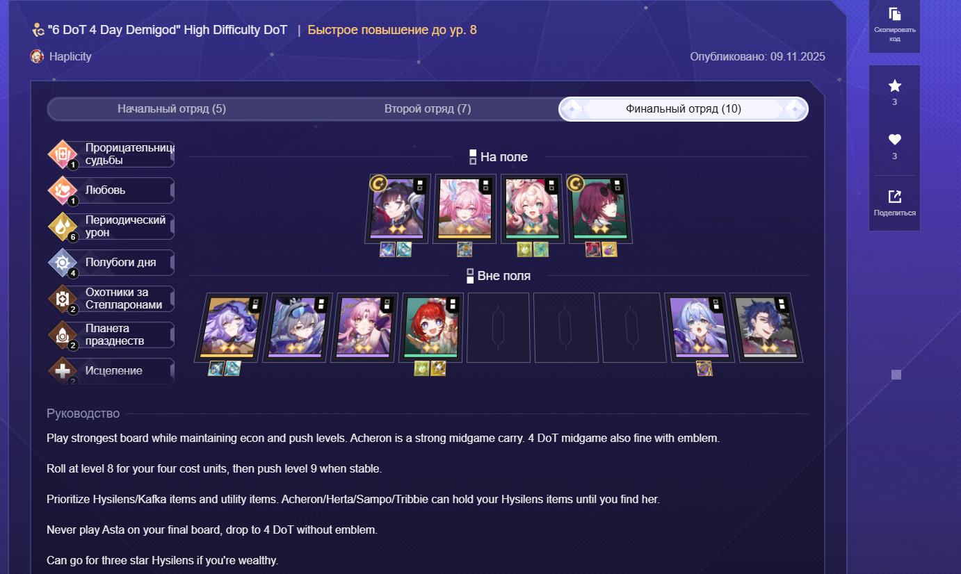Реально решил открыть эти руководства, поставил фильтр по связи дотов и какая же там дичь. Всё ебало в 4х стелларон хантерах, ни одной команды с вменяемым сустеном, физически способным выживать не высокой сложности не нашёл. Из самого весёлого, в одном из популярных руководств советуют поменять Гиацину на Линшу вжушк