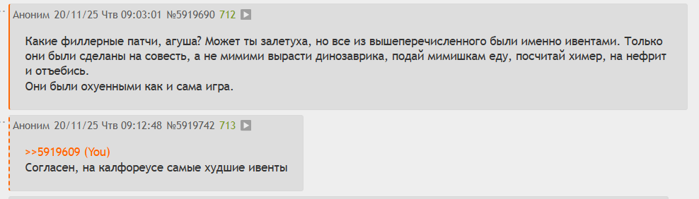 Какие филлерные патчи, агуша? Может ты залетуха, но все из вышеперечисленного были именно ивентами. Только они были сделаны на совесть, а не мимими вырасти динозаврика, подай мимишкам еду, посчитай химер, на нефрит и отъебись. Они были охуенными как и сама игра.