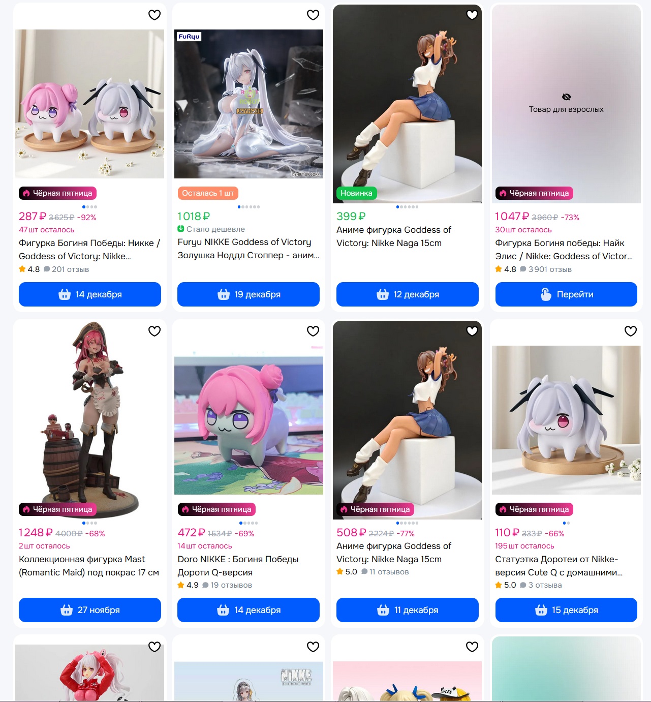 >>5943730 Полистал товары и отзывы, чисто по приколу: Даже я, нищук, не взял бы такие фигурки ни себе, ни, тем более, в подарок. Качество ну очень не очень. Упаковка- дерьмо, много побитого. И делать с этим ничего не будут. Плюс, ноль конфиденциальности, хотя, там, наверное, и дилдак придёт в родной упаковке... Лучшая фигурка- Доро.