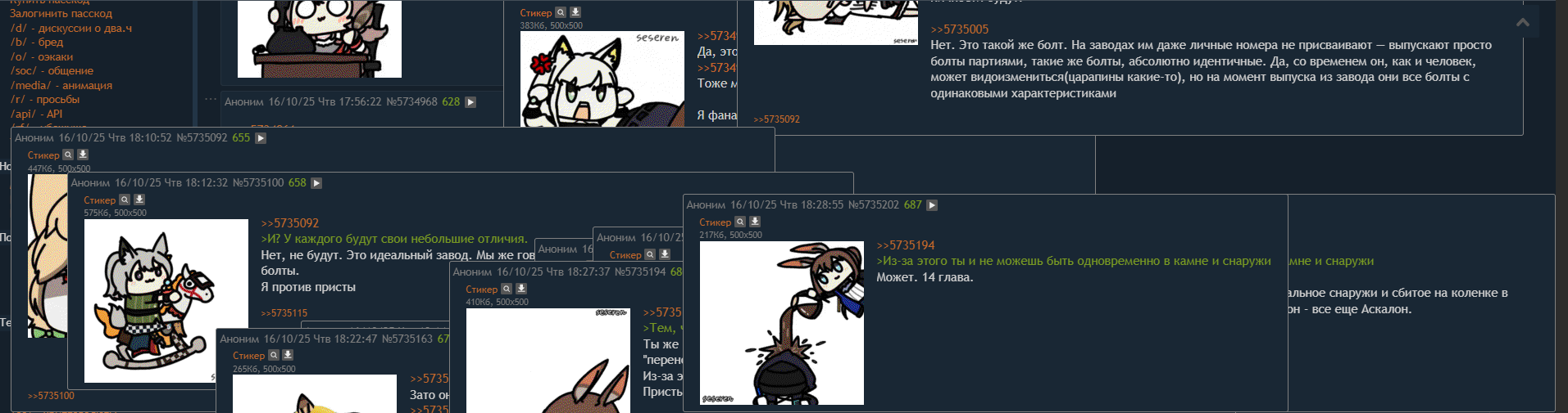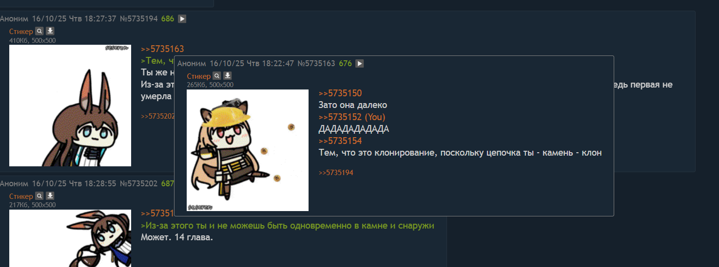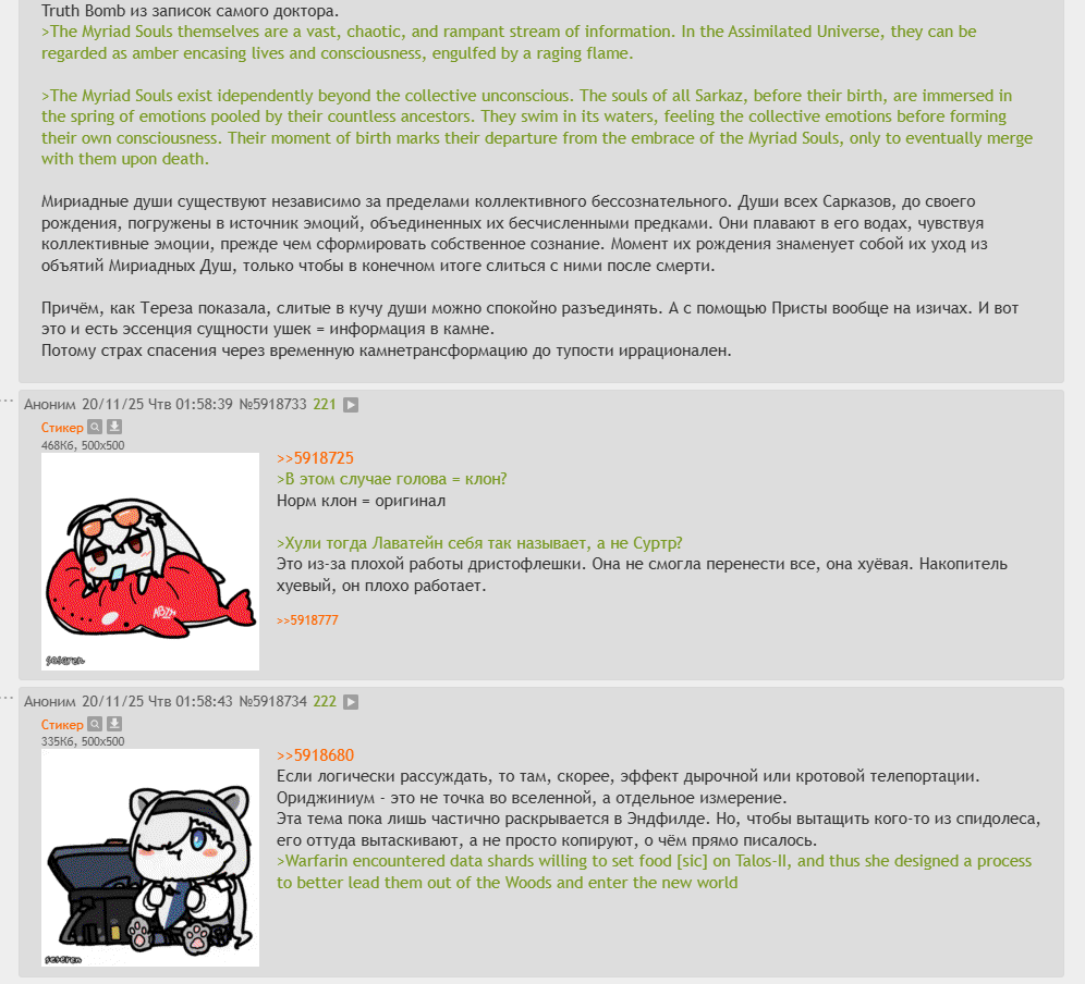 >>5918651 > Когда камень тебя поглощает - оригинальное тело умирает В битве с PRTS Амия и ко. со слов элитных операторов исчезли из реальности, ака переместились в ассимилированную вселенную через спидораковый камень. Что, хороним её, всё? А myriad of souls от Сарказ, который внезапно тоже в спидораковой вселенной физически находится. Для них жить = иметь душу, которая уже находится в камневселенной ещё до из рождения. Ушкотушка - манифестация физической формы. В матчасти ревенантов, которых воплощали через Амнаннам (один из истинных спидокамней) это хорошо описано.