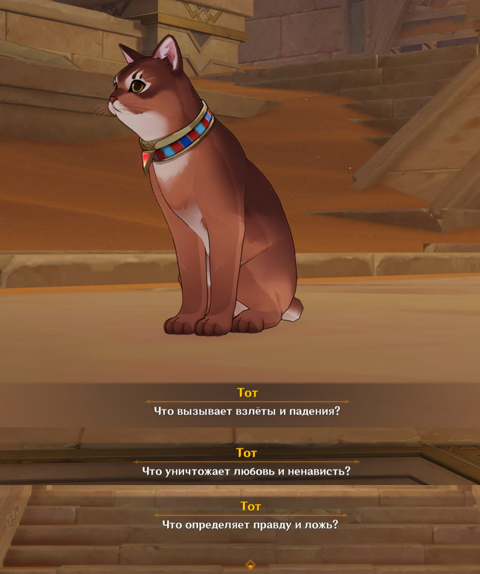 Тот(кот) был заперт Дешретом в Ааре и может освободиться, только найдя человека(человеков), что смогут ответить на три вопроса ПО ЕГО ПРАВИЛАМ. Вопросы мы знаем, а правила кот нам не сказал. И тут начинается самое интересное.