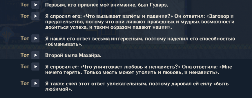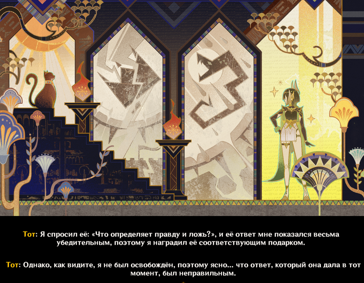 А вот тут и начинается суть правил Дешрета. Я думаю, что нужно не только ответить на вопросы, но и подтвердить их в ходе своей жизни. Первый чел ответил "предательство", получил искусство обмана от кота и в итоге от этого и помер. Вторая ответила "месть", получила искусство обольщения и в итоге умерла от этого... Нефер тоже ответила, тоже что-то там получила, но ещё не закончила свой путь.