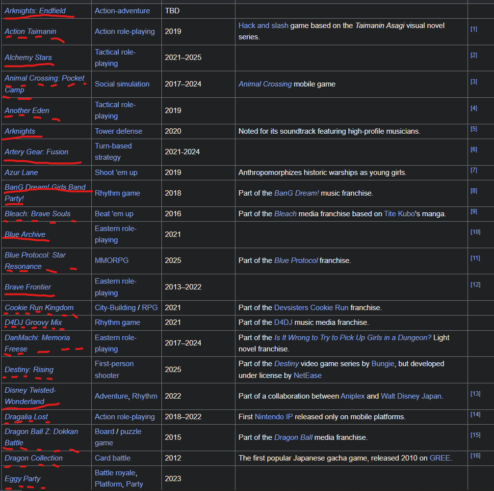 Наконец то перекатили. >>5921878 → Ну вот тебе начало листа гача геймов, дальше можешь продолжить сам. Сплошной линией отмечены игры с плееринсертом и скрытой внешностью (так уж и быть, ояшей подчеркивать не стал, хотя стоило бы). Пунктиром отмечены игры без плееринсерта и игры с чарактер криейтером. "В гаче всегда плееринсерт", к слову.