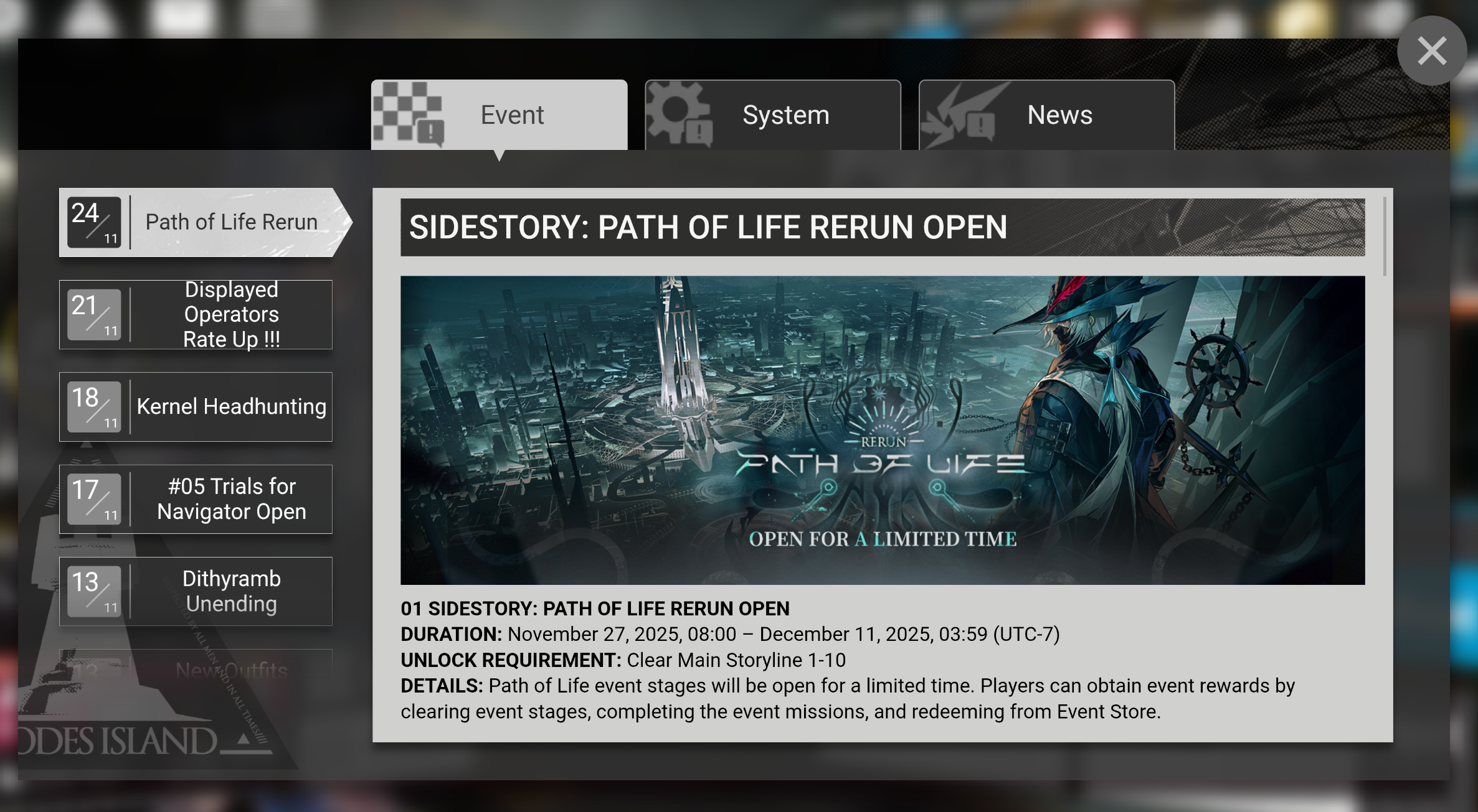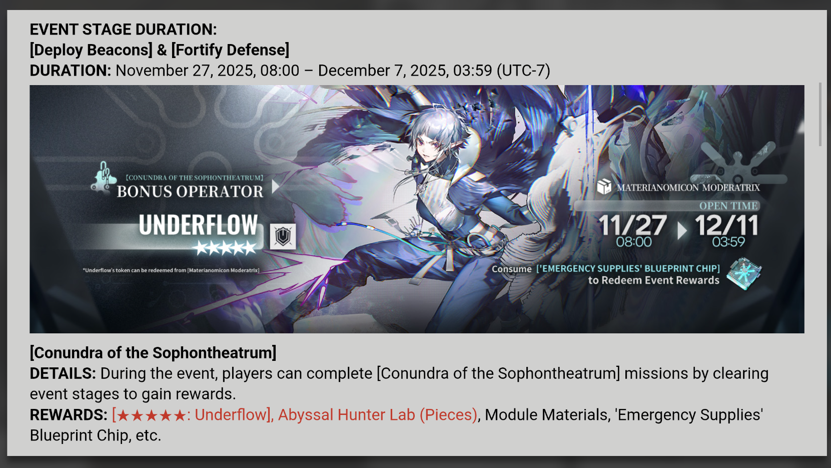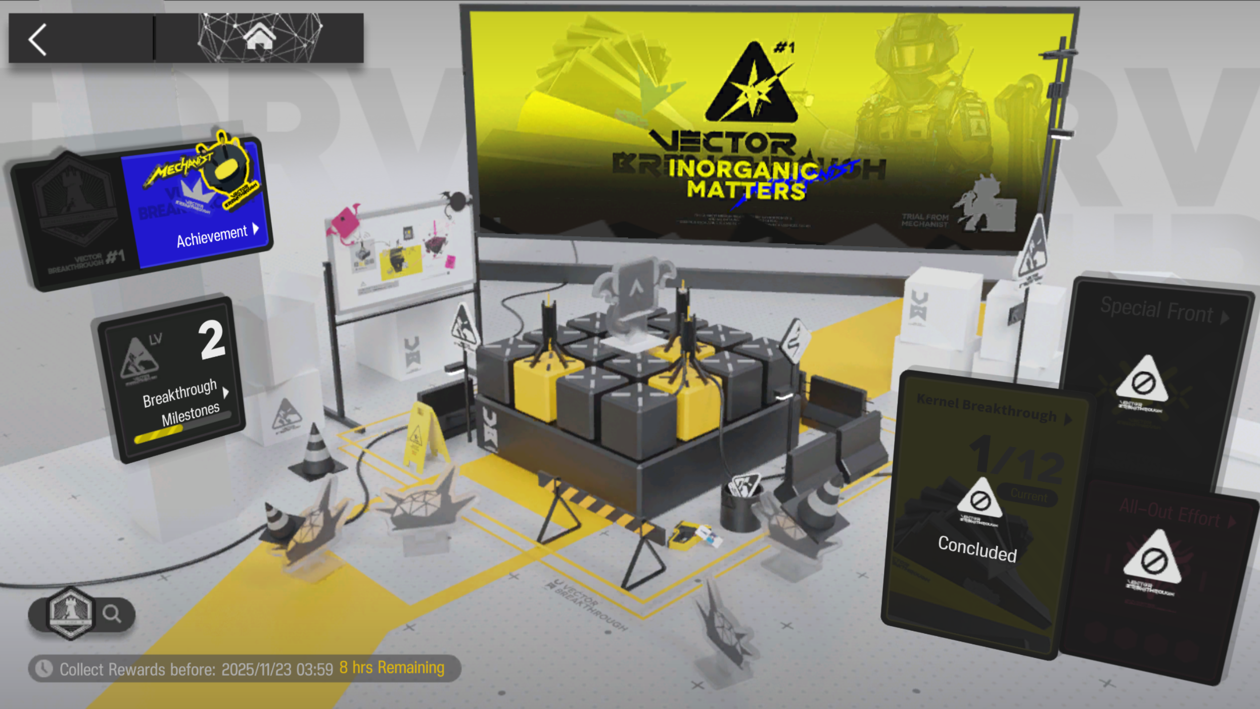 Открыт ивент Vector Breakthrough #1 Inorganic Matters. Vector Breakthrough #1 Inorganic Matters начался 30 октября и продлится до 20 ноября, участвуйте в сложных боях с элитным оперативником Механистом и получайте разные награды! Также в ивенте присутствуют свои бафы, для получения которых надо проходить отдельные карты и оставлять там операторов, с которыми и прошли, в гарнизонах. Операторы из гарнизонов недоступны в линейке боёв, только если их заменить другими.