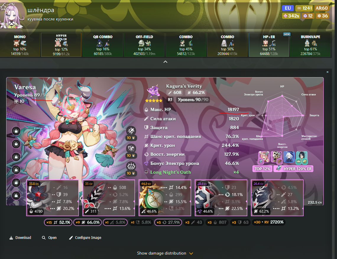 Мопед - это надежность, как ни крути, там всегда ок с КШ и "энергия" 100% набирается, потому что заряжается от ночного духа, от Шилонен в частности и немного от Бабули, главное уловить этот момент ультования с таянием, что так-то изи, ну и в принципе все. И это самая простая в плане снаряжения пачка, потому что на арты Шилонен вообще пофиг, норм играет с фавонием и в сабстатах немного КШ и восстановы, защита там для доп хила. Беннет уже давным-давно у всех одет, тут без вариантов, ну и Бабуля вообще ок в инструкторе, восстановы чуток набрать и эпос дать, все. У остальных такой халявы нет, там и саппортам нужны неслабые арты.