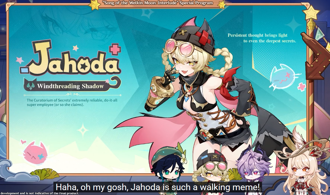 Кажется в этом патче нас наконец-то ожидает раскрытие связи Венти и Астарот, его силы времени или что-то вроде того. Это же круто! Это заявочка на саму Астарот... Астарот, кстати, которая тоже не менее эффектная женщина с такой же смешной каркасной шляпой. Если не нравится Алиса - всегда можно засолить гемы на Астарот, потому что Астарот - это база.