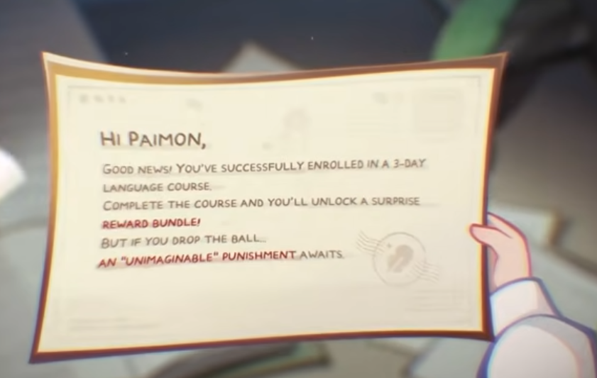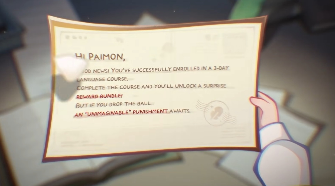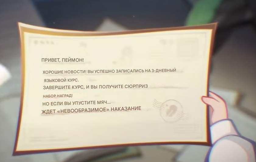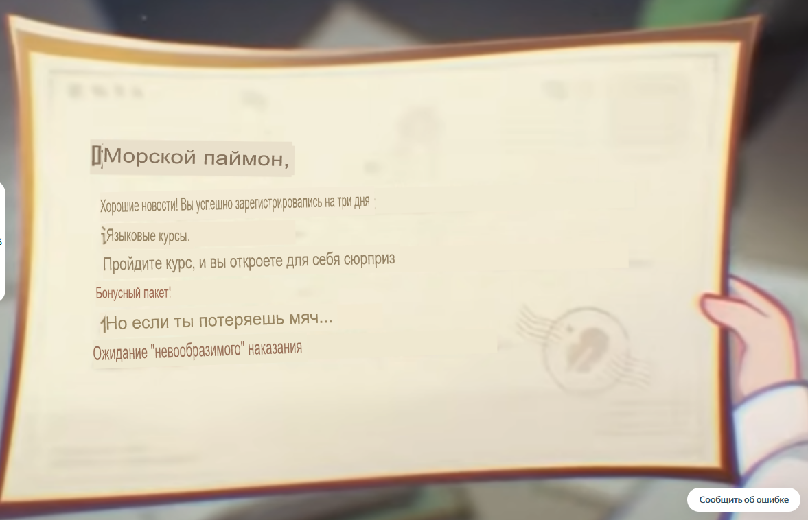>>5928010 Привет Паймон Хорошие новости! Ты успешно выкрутила 3-дневный языковой курс Заверши курс и откроешь бандл с наградами! Но если ты сбросишь яйцо... "Невообразимое" наказание ждёт тебя.