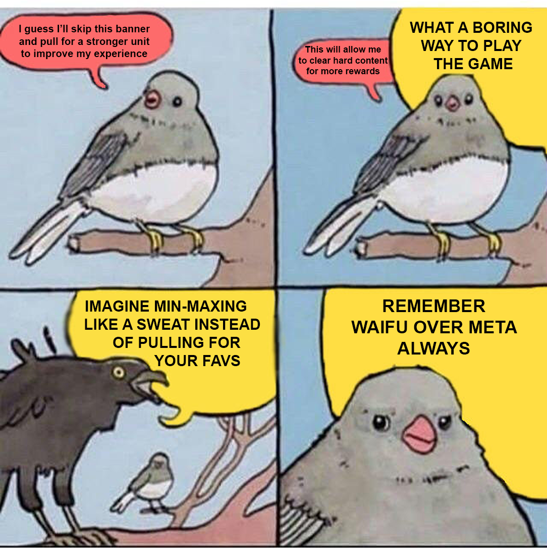 Мне надо прекратить крутить баннеры отряда Руки, их слишком сильно распирает от мощи, читеры. Всему виной импульсивные крутки и лишняя удача, 1 унисон пережили осталось еще 2. А то сначала крутани этих и этих до лб4 а потом додепай на метовые SSRы, знаем мы эти уловки п2в ггшек игры. А Ошимы они всегда бедные, выходят раз в полгода, всегда тир3, всегда свои для ф2п бомжеанона. Не настолько как разрезающая до еоса воздух Инорин2 и все ее 4лбшки с шардов но тем не менее.