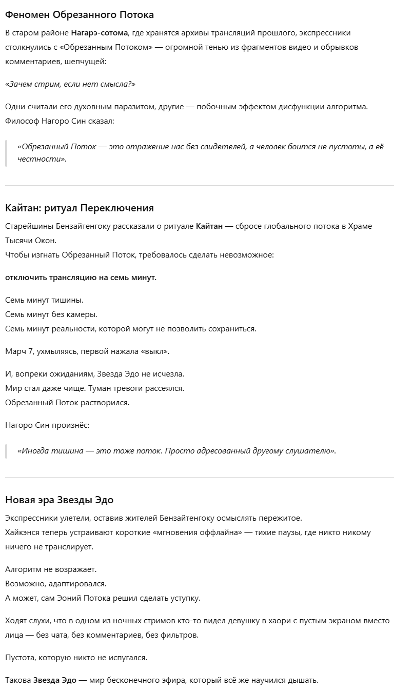 > понравилось всё, кроме Кастории и Гицины Ща, попробую сам выделить даже. 3.0 Засрано всё чёрными экранами и пустыми разговорами. - КАЙФ. Больше всего уделено внимания флирту между Фаеноном и Мидеем. - КАЙФ. 3.1 Слёзодавлка про Триббиус. - КАЙФ. Баня Фаенона с Мидеем с историей про его дохлую мамку и дохлого фембоя. - КАЙФ. 3.2 История про девочку, которой очень хочется обниматься. - КАЛ. 2 строчки про природу Амфореуса от Анаксагора. - КАЙФ. 3.3 Никчёмная смерть Аглаи - КАЙФ История про Селеозу, завершают которую сочным появлением Фаенона. - КАЛ Смерть кошки за 2 строчки, реюзая локу Кастории. - КАЙФ