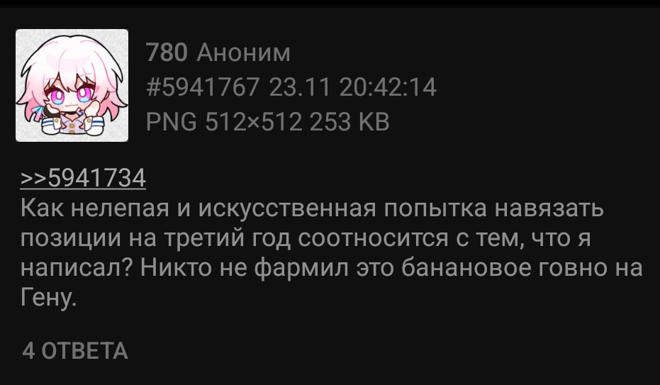>>5941734 Как нелепая и искусственная попытка навязать позиции на третий год соотносится с тем, что я написал? Никто не фармил это банановое говно на Гену.