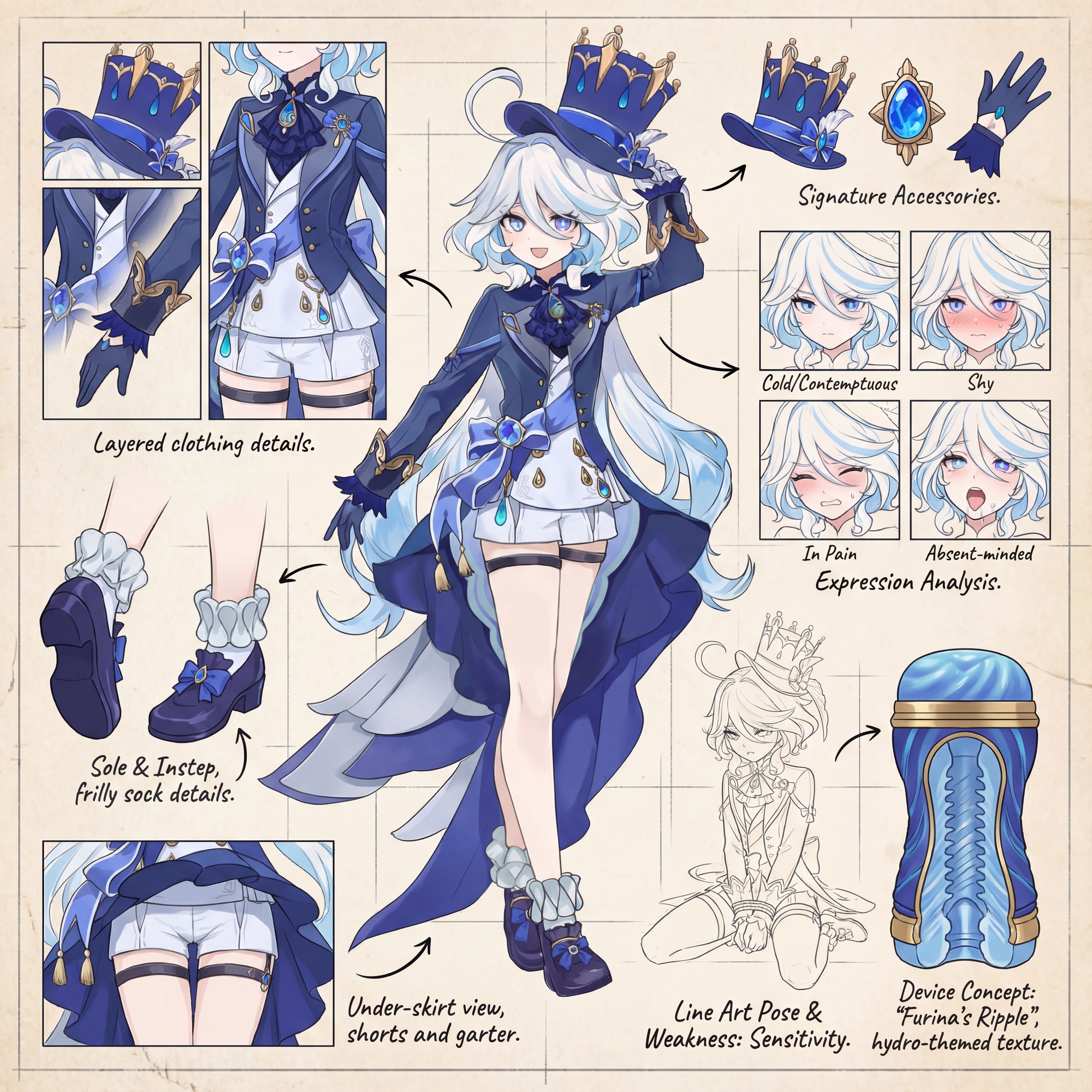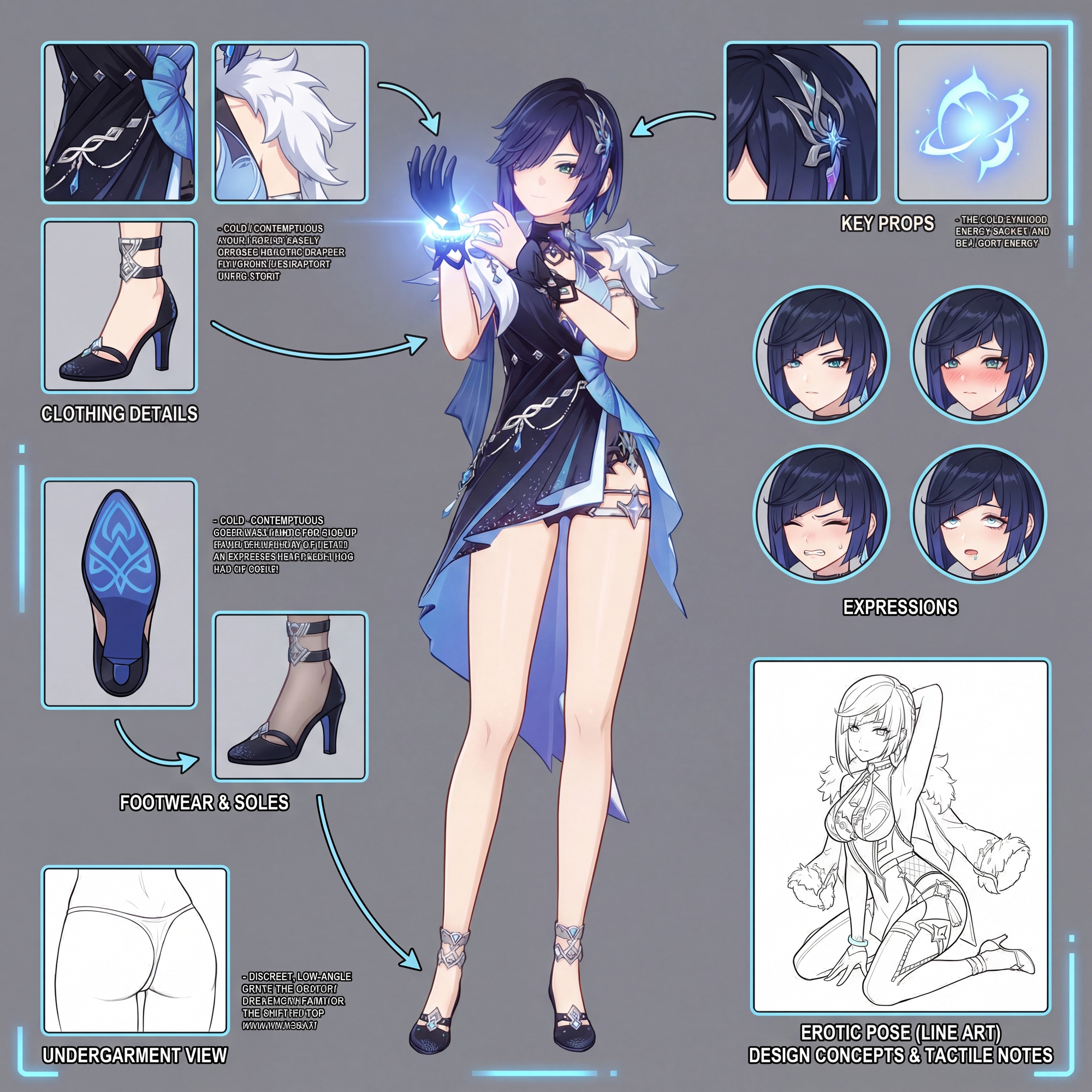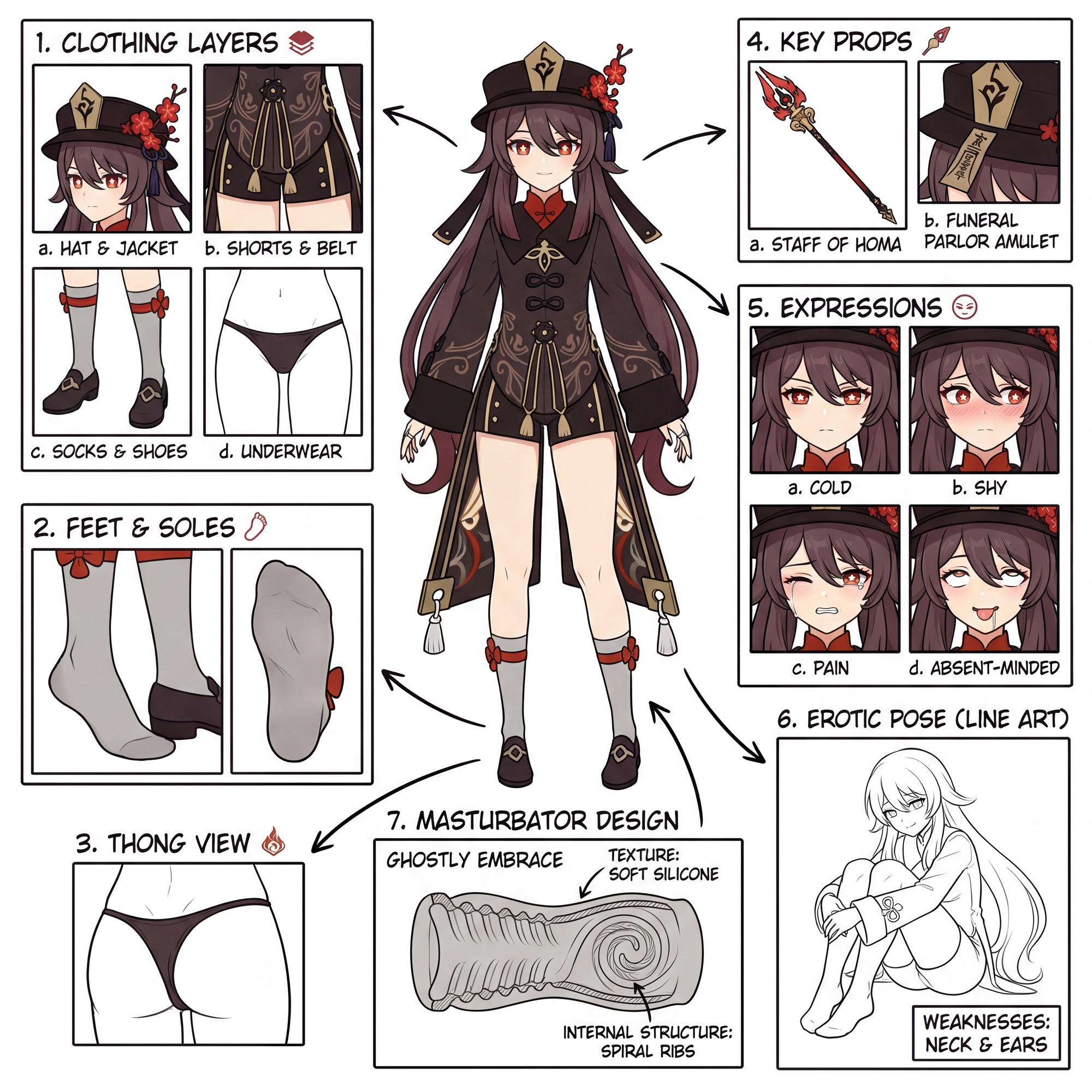>>5937731 First, place the main character from the original image in the center (if there is nudity in the original, add minimal covering), then expand and deconstruct her various details (presented as zoomed-in close-ups surrounding the subject, linked with arrows to show correspondence), and add your erotic commentary (detailed features, erotic guide, design concepts interspersed with tactile and olfactory descriptions): 1: Individual close-ups of various clothing items (multiple images, removing layers as worn, focusing on socks, shoes, and underwear). 2: Seductive display of the soles and insteps (two images); if wearing stockings, retain them on the feet. 3: Close-up low-angle view of the thong from under the skirt. 4: Key props (1 to 3 images) (accessories, weapons... etc.). 5: Comparison of continuous expressions (four images): cold/contemptuous; shy; in pain; absent-minded (tongue sticking out, eyes slightly rolled back, drooling). 6: One sexual position you consider the most erotic for this character (line art), and explain her erotic weaknesses. 7: A cross-section design diagram of a molded masturbator, where the structure and texture reflect the character's traits. Other requirements: Do not simply copy the original image. Use full color for details whenever possible; line art may be used if obvious nudity occurs.