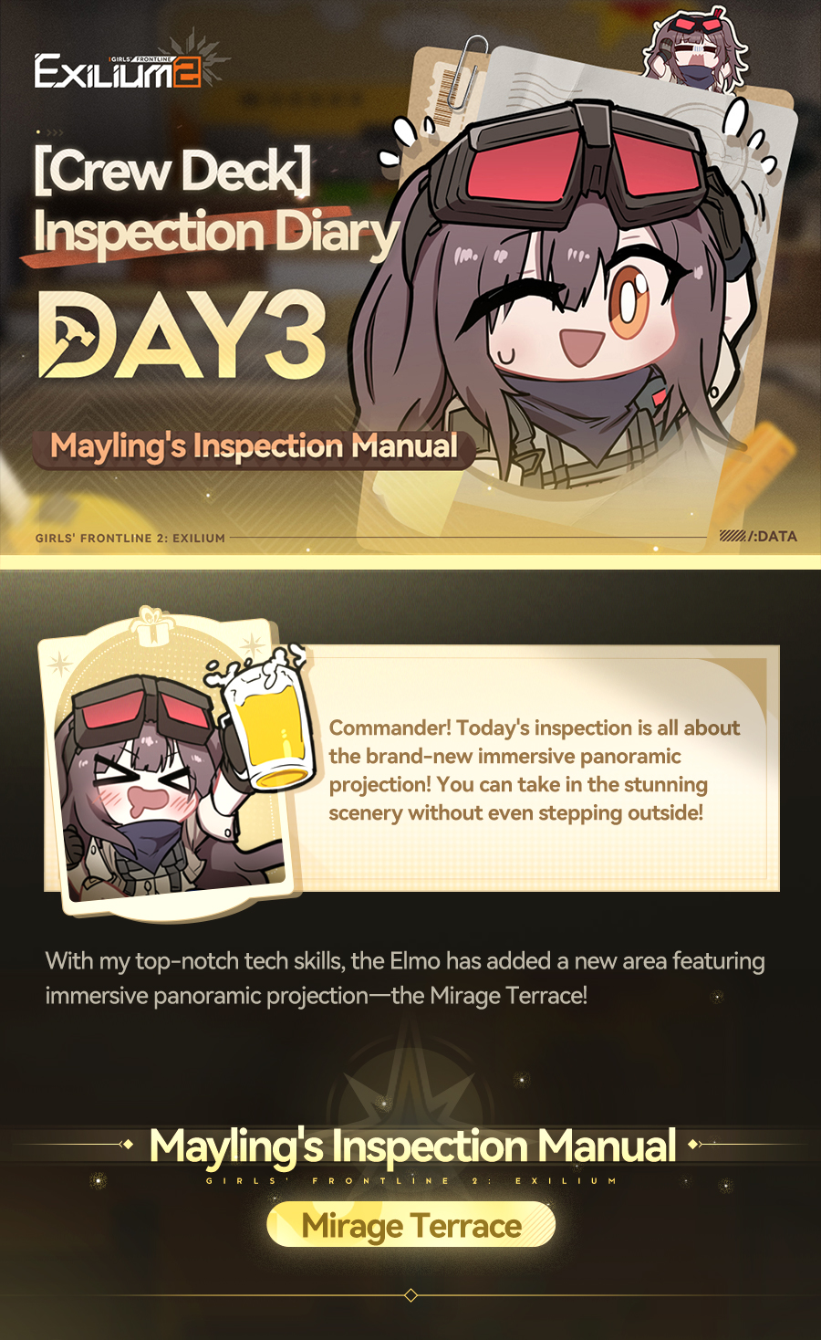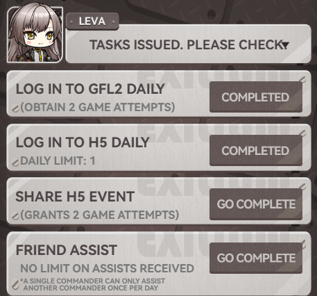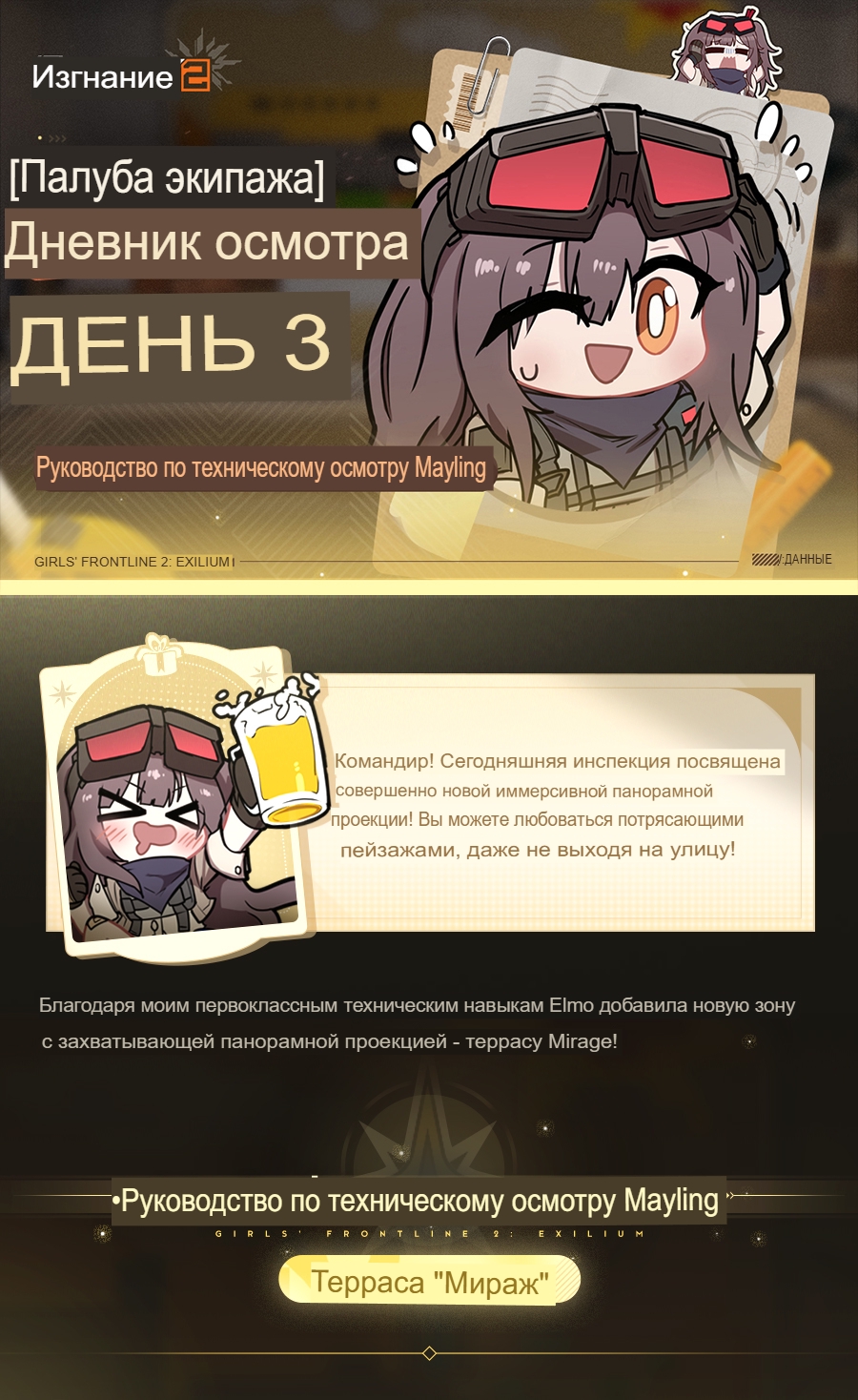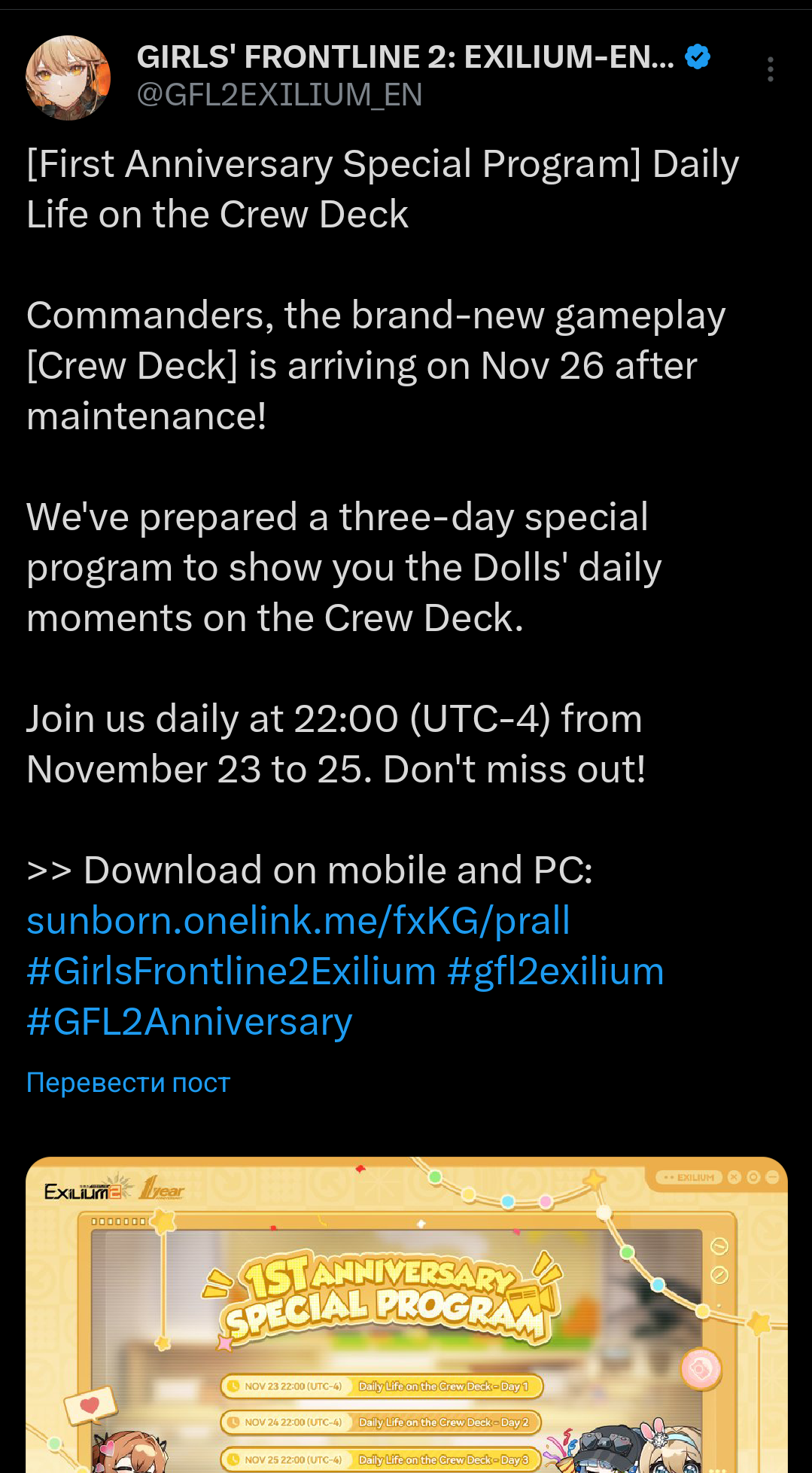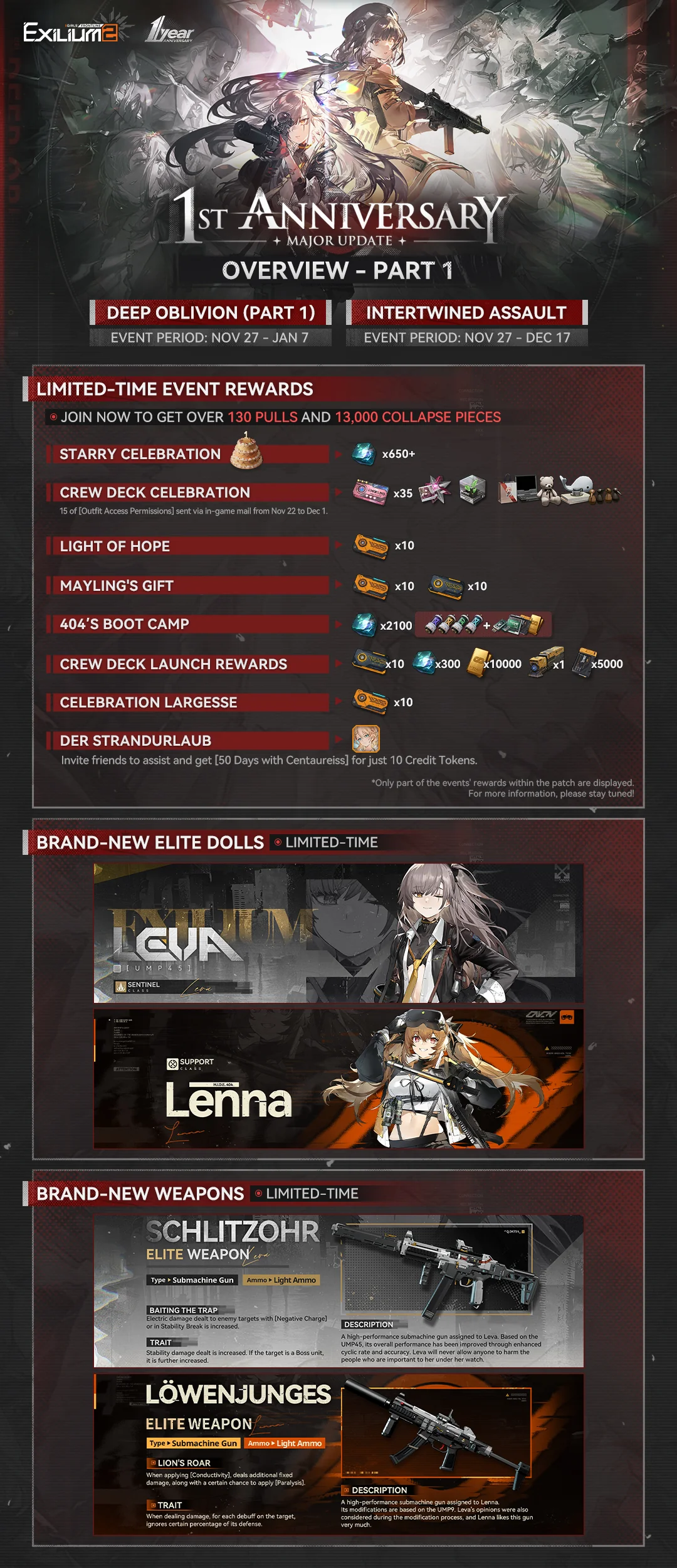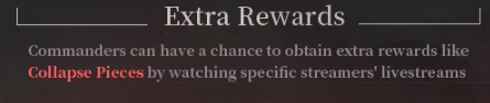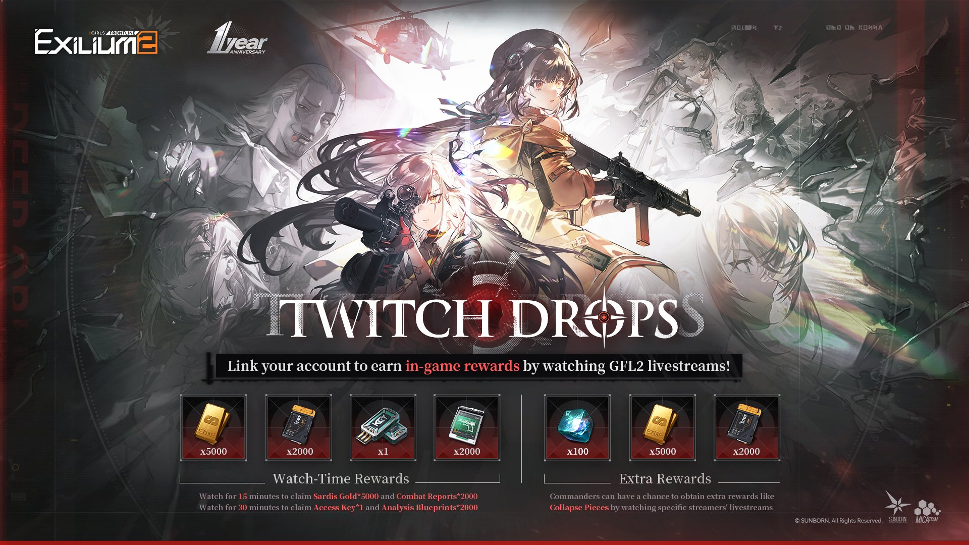 Нужно БОЛЬШЕ ивентов. Завтра в 8:00 по МСК начнутся дропсы на твиче. Крохи, но может кому надо. Работает только на ДВ, почему для Хао нету ХЗ. Все награды за 30 минут просмотра, 100 коллапсов падают рандомно. https://gf2exilium.sunborngame.com/drops/