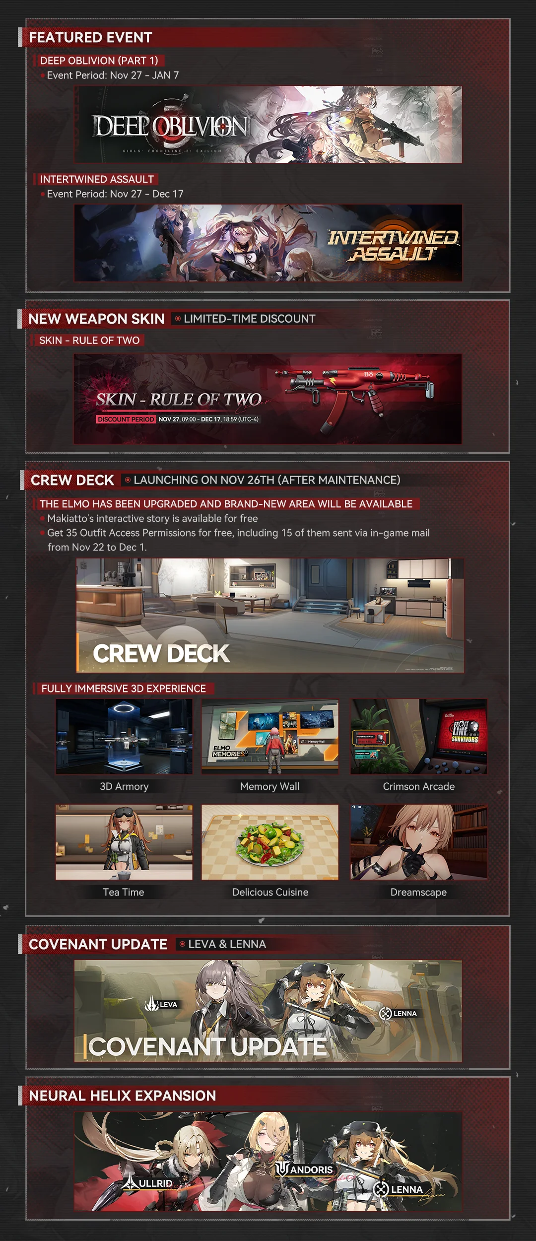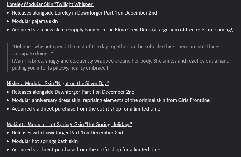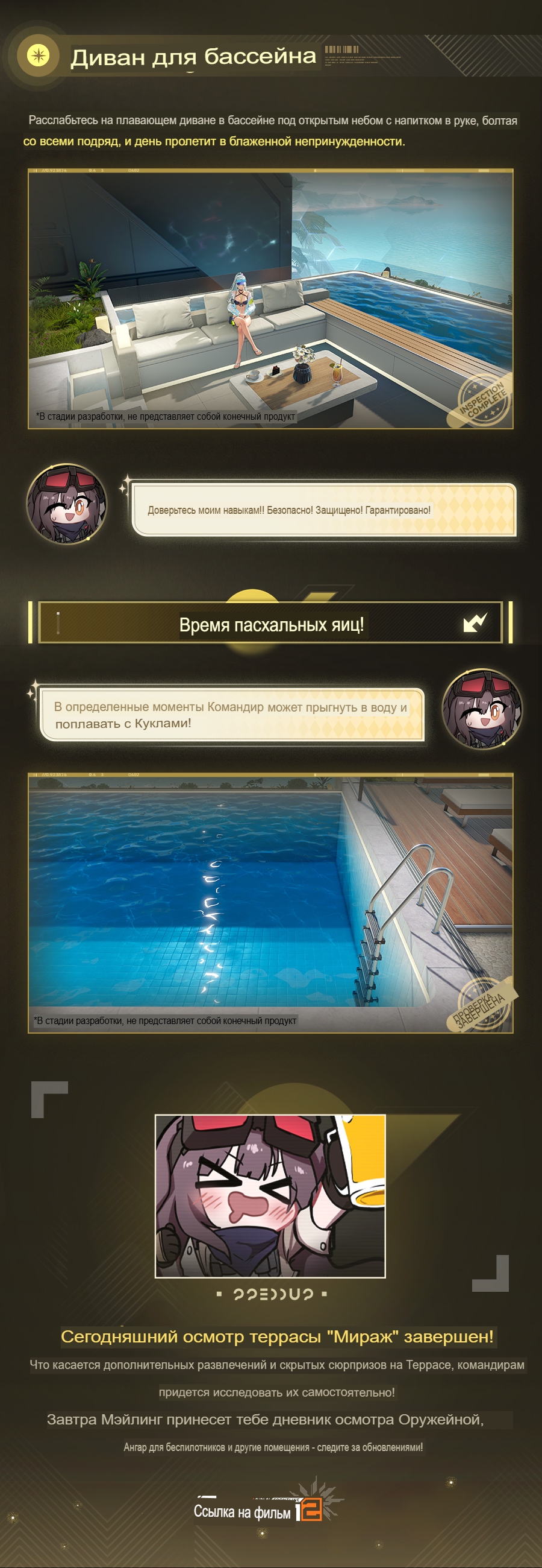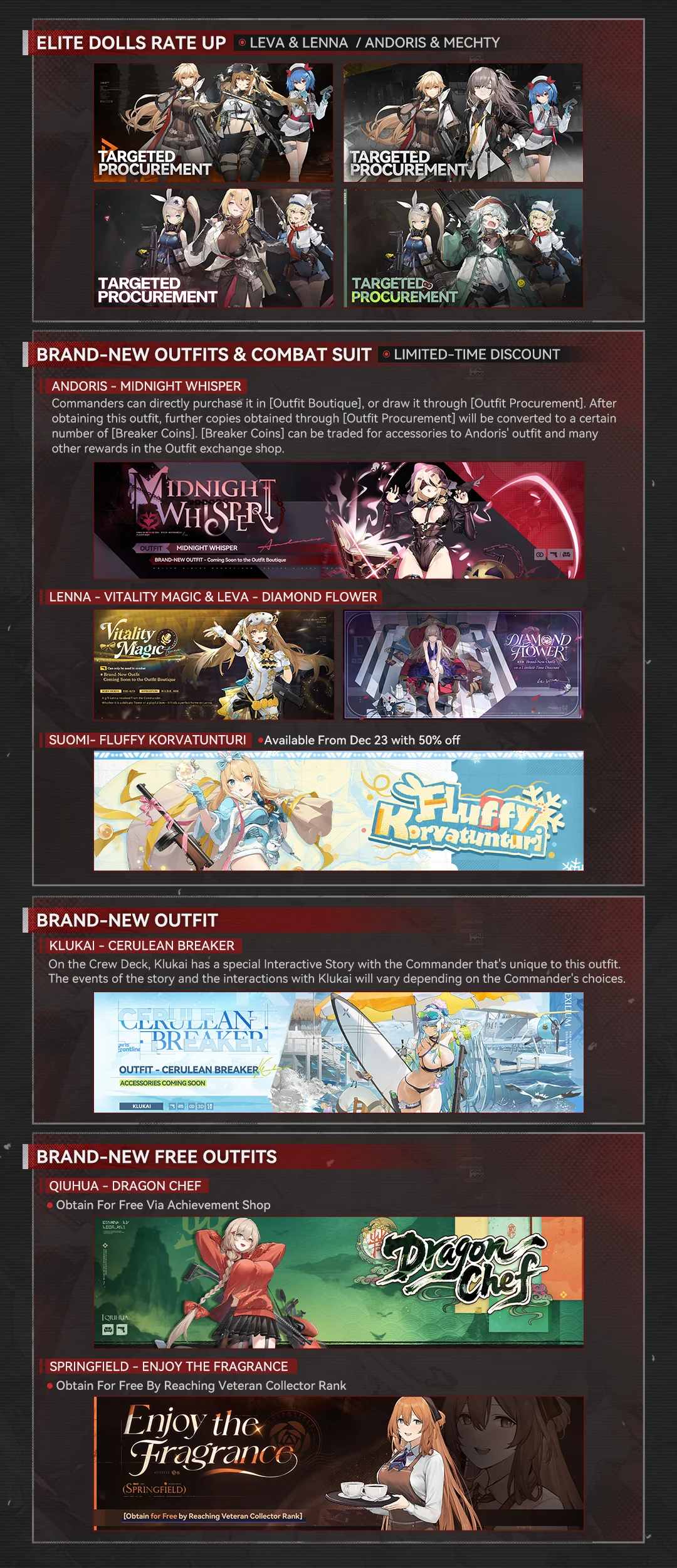 Самое главное с китайской 2-ой годовщины. 1) Новые куклы: Лорелей (ДСР-50) – Огненный саппорт с винтовкой. Харпси (ТМП/Mp9) – Корозийный булварк с ппшкой. Будет новым персонажем стандарта. Будет роздана 1 бесплатная копия (как уже было с Фае). Шайенн (Чейтак M200) – винтовка Сентинел. 2) Cкины: Платье на жопкиту, модульное банное полотенце на Ваву, рождественский скин на Суоми (выйдет у нас на глобале 23 декабря), модульный скин на Лорелей будет в скиногаче, платье на М200. И самое главное – СКИНЫ КУПАЛЬНИКОВ НА ШКИКАНОВ! Затизерили скины платья на Рошку, ципао на Вора Спермы Флоренс и скин школьницы на Альву. 3) Геймплей: Ключи расширения на Клюхера и Лейни. Обещают крупные апдейты и переработки «Таркова», изменения работы элементов и элементальных клеток, а также новую коопную активность для кланов. Всё на 26 год. Возвращение Heavy Ordinance Corps в виде BGM-71 TOW. Будут в этой новой активности кланов. В дорм добавят новый режим, где Шкиканам придётся сражаться ЖОПАМИ с куклами. Новый (или переработанный) рогалик с диалогами.