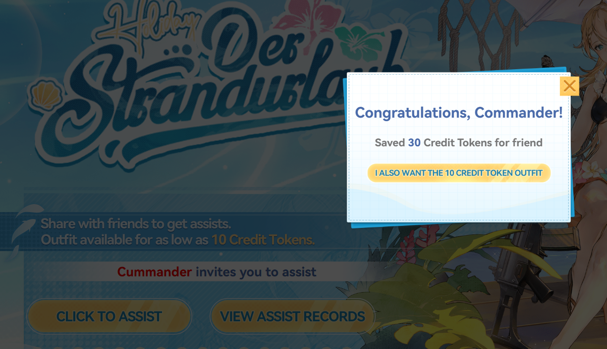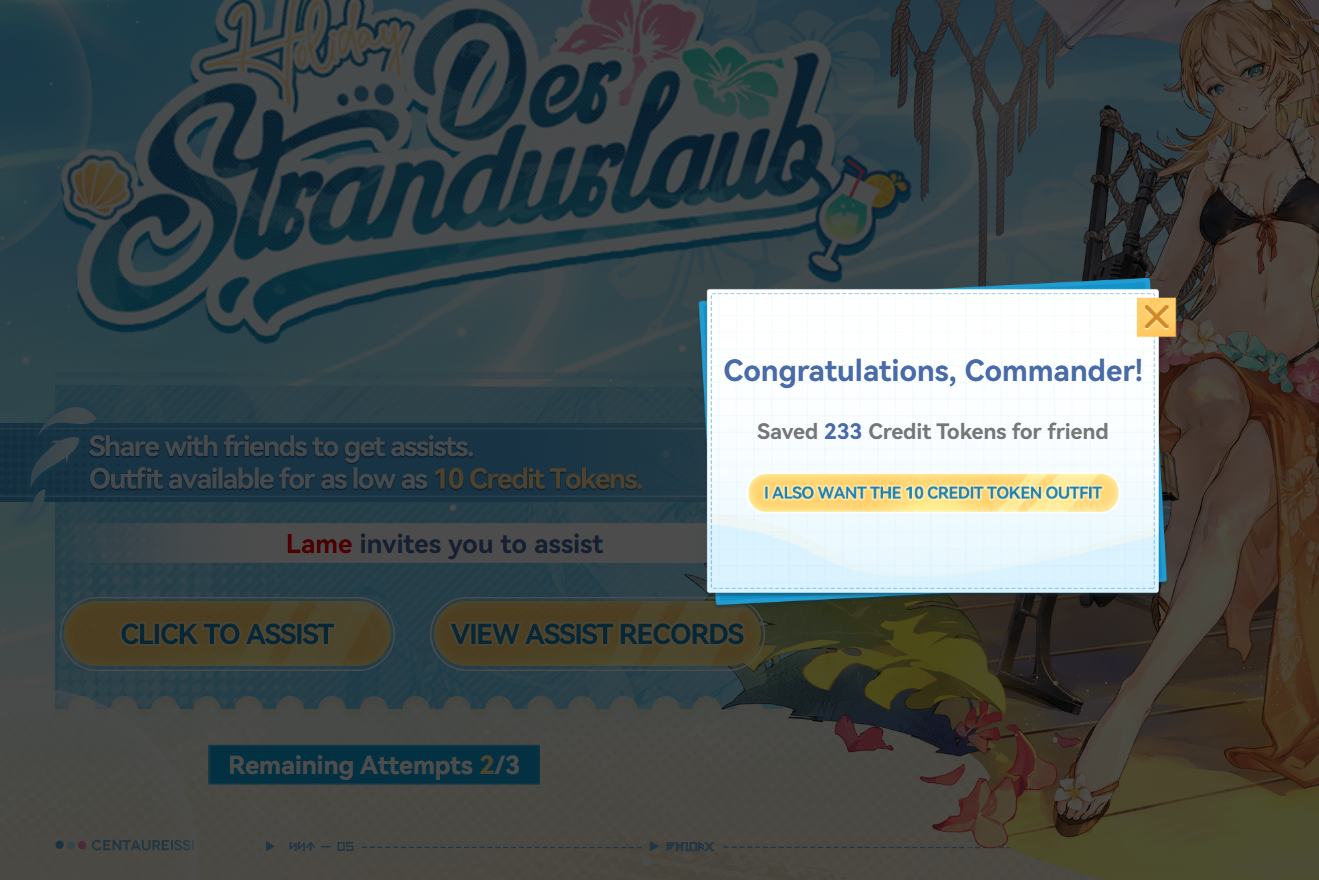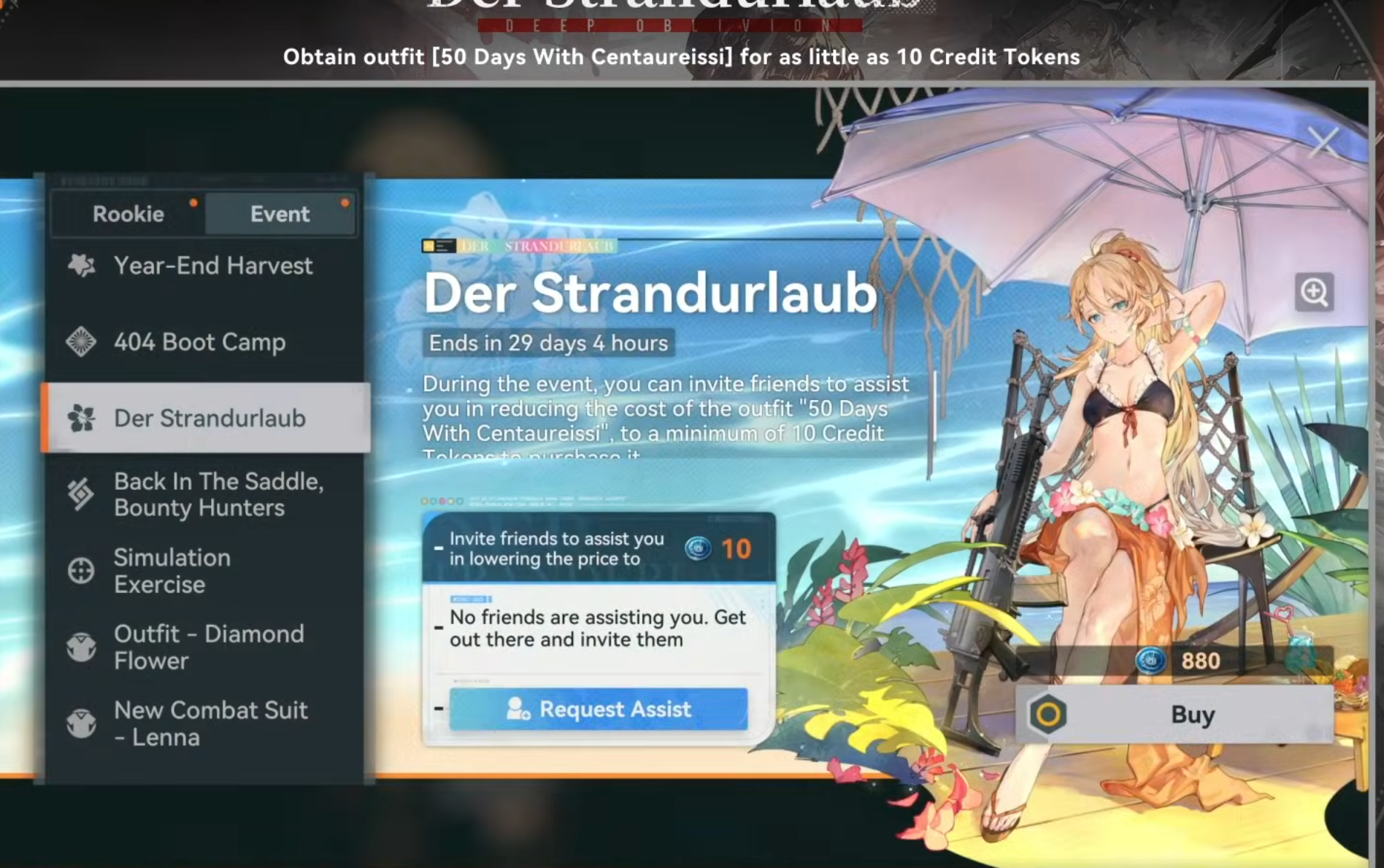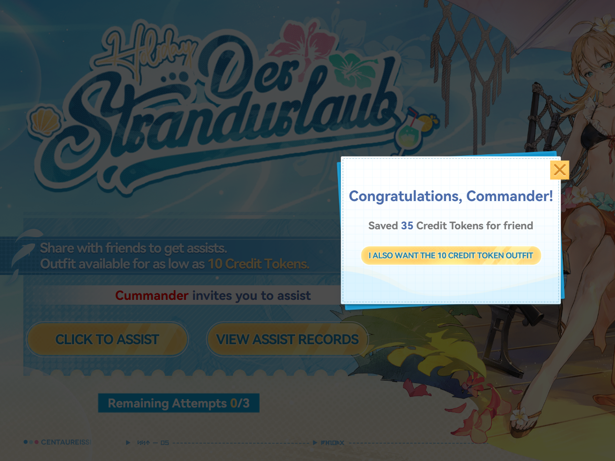 Come and Join the [Der Strandurlaub] Event! Share to get Assists for Credit Token discount! Centaureissi's new Outfit [50 Days With Centaureissi] available for as low as 10 Credit Tokens!