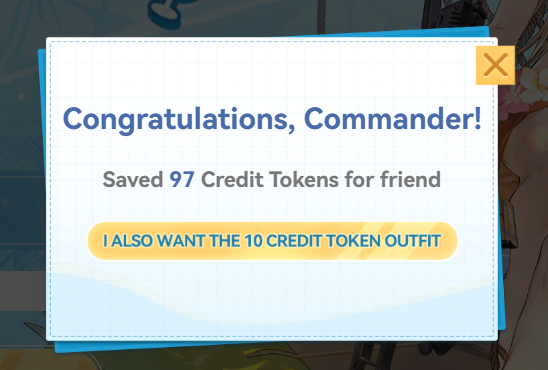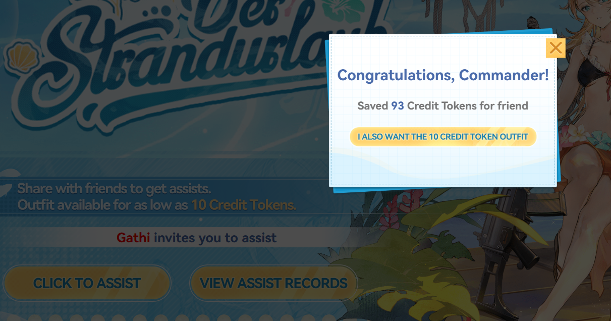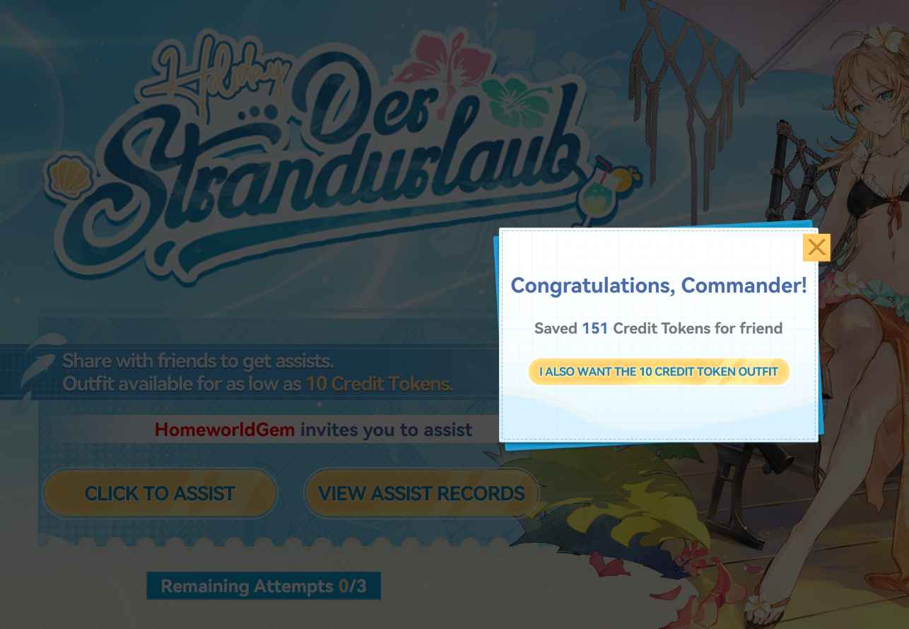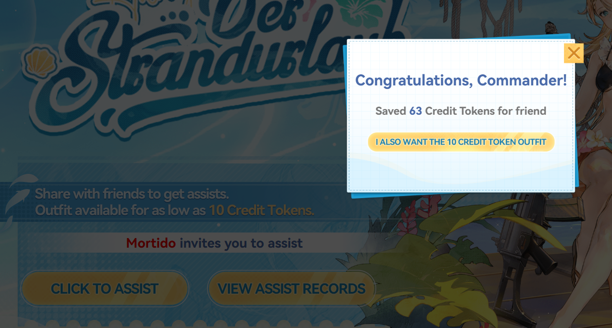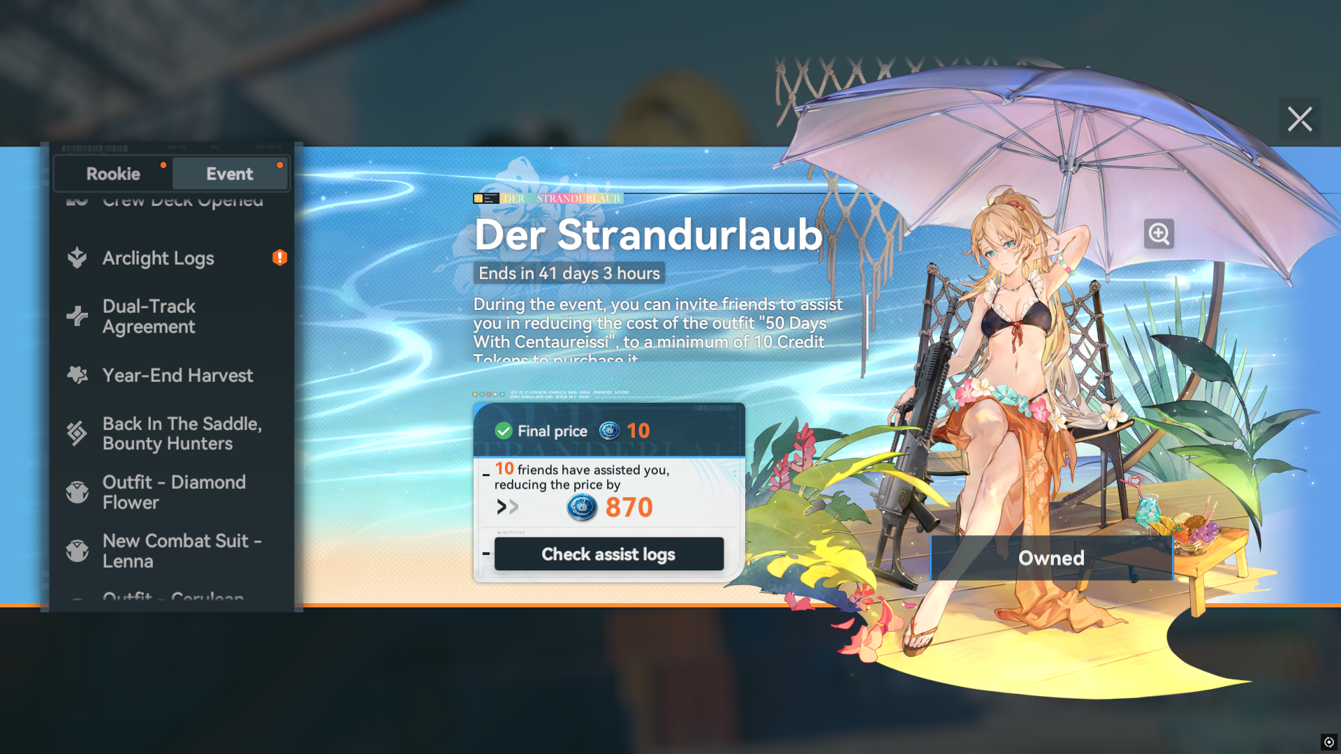 Come and Join the [Der Strandurlaub] Event! Share to get Assists for Credit Token discount! Centaureissi's new Outfit [50 Days With Centaureissi] available for as low as 10 Credit Tokens!