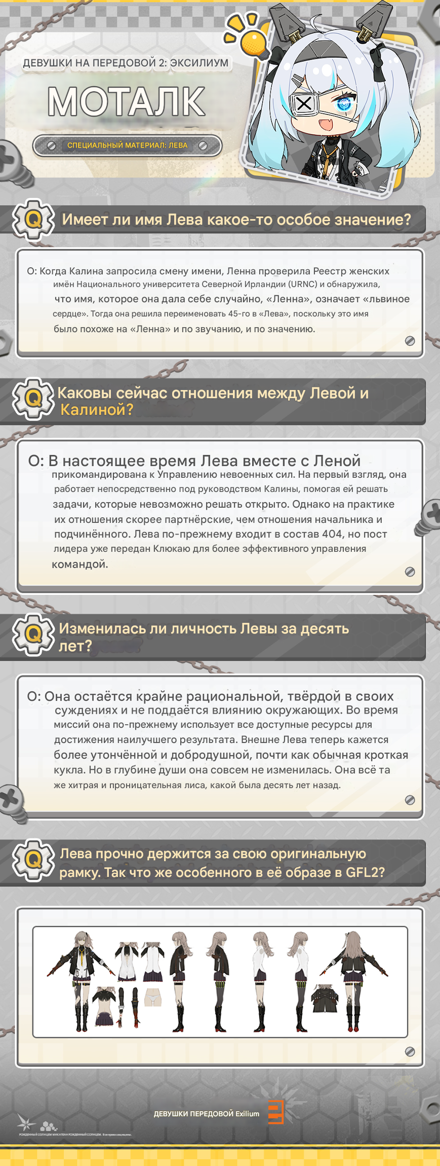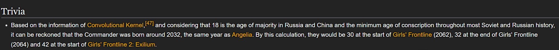 >>5959954 >>5959970 Ну, вот такая инфа на IOP вики. Я неё взял про 40+ Based on the information of Convolutional Kernel, and considering that 18 is the age of majority in Russia and China and the minimum age of conscription throughout most Soviet and Russian history, it can be reckoned that the Commander was born around 2032, the same year as Angelia. By this calculation, they would be 30 at the start of Girls' Frontline (2062), 32 at the end of Girls' Frontline (2064) and 42 at the start of Girls' Frontline 2: Exilium.
