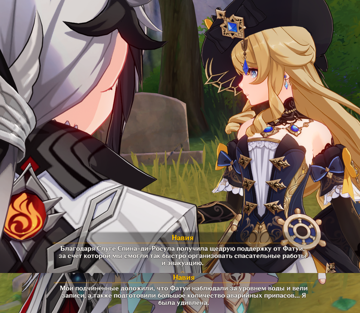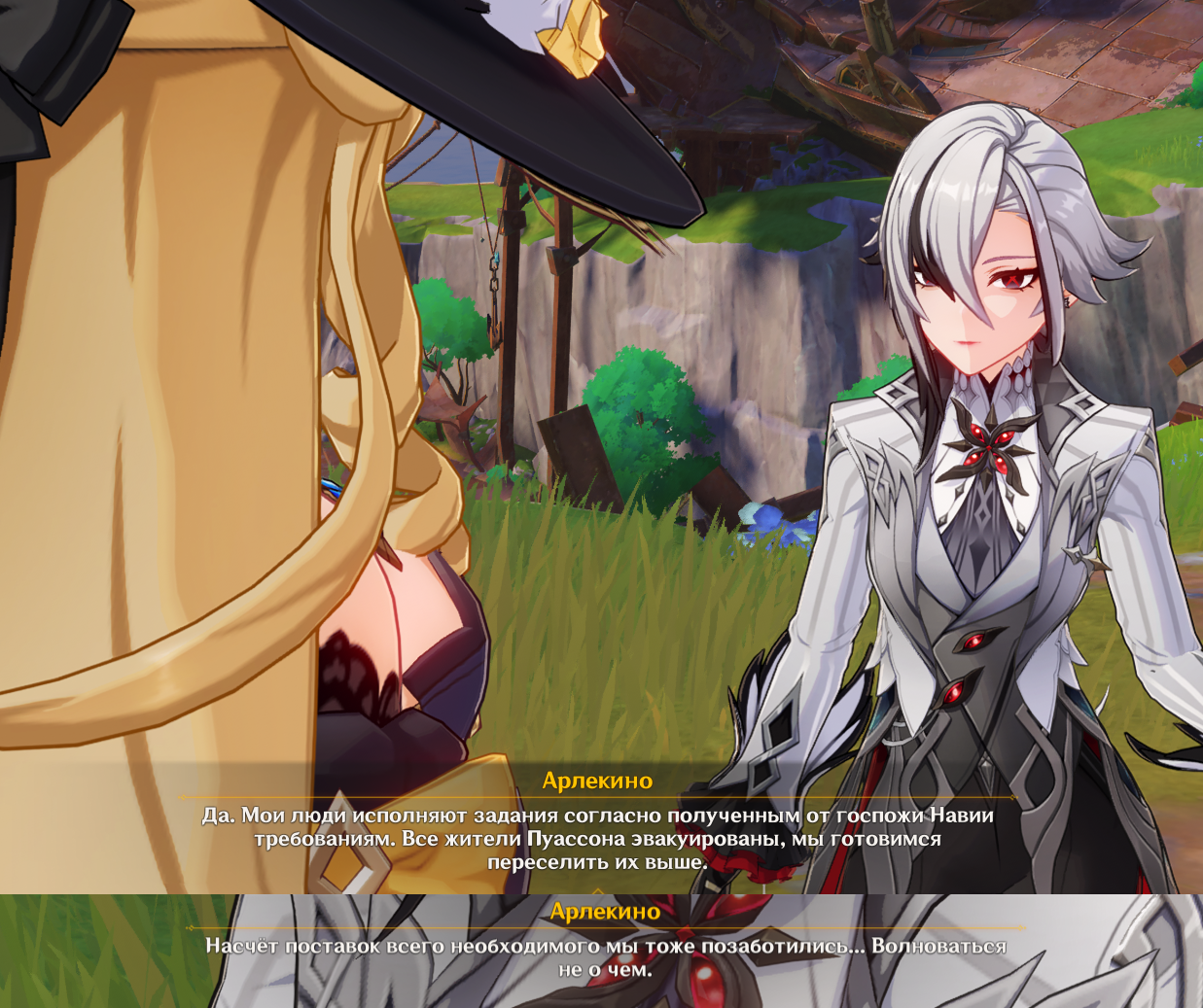 Зато когда мы пришли и оплакивали с Навией погибших, оказывается, что единственные, кто помогал - фатуи, блять! Арлекино все свои ресурсы Снежной задействовала, которые у неё были под рукой, чтобы помочь в эвакуации. Но и не только! Оказывается она ещё и отслеживала ситуацию, держа руку на пульсе. Арелкино! Представитель другого государства, ресурсами другого государства! А где Нёвиллет! Где, блять, жандармы?! Он же вроде как имеет на них инструменты влияния, у него есть ресурсы. Тут даже к Фурине претензий меньше, хотя вопросики остаются, но она всё равно не располагает тем административным ресурсом, который есть у Гидро Дракона... Почему он ничего не делает?