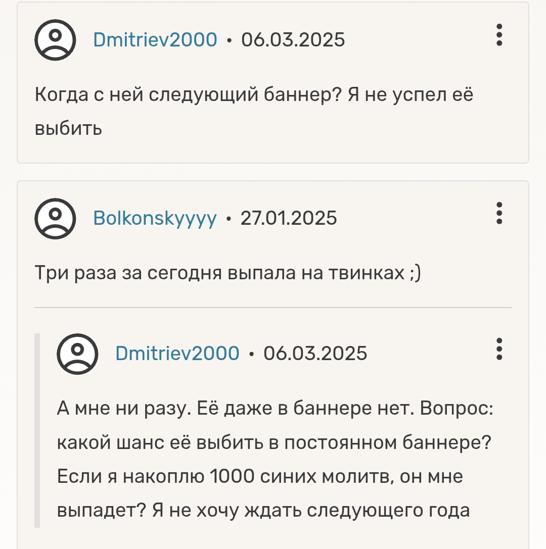 Продублирую свои мысли из соседнего треда. Что думаете? Я так недавно начал в Геншин играть. И вместо Нефер получил Тигнари. Неприятно было. Мне кажется на первые 50/50 можно было бы в гачах получение лимитки сделать гарантом. А то сразу неприятно настраивает на дальнейшую игру таким прикладом. Они буквально ничего бы от этого не потеряли. Зато закрепили бы в сознании новых игроков приятные эмоции и мотивацию продолжать играть