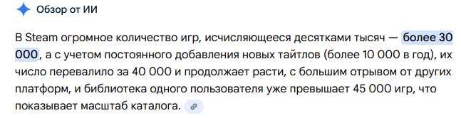 >>6059661 А, ты из этих, кто познает мир через нейронки. Ладно, давай помогу тебе. Процентов 80 здесь всякий порно-мемный-нейронный-нонейм мусор, который даже бесплатно добавлять в библиотеку зашквар. Все остальное либо старье мамонта по 90% скидке, которое скорее всего на новых компах и не запустится даже, либо очень популярные лоупрайс тайтлы, которые все и так давно купили, либо новые и относительно новые игры 4к гейминг без учета длс. На 1.5к разве что повезет хоть 1-2 нормальных, чуть постаревших игр относительно урвать. Либо новое длс на скачи мочи на корабликах, которое вышло недавно. .